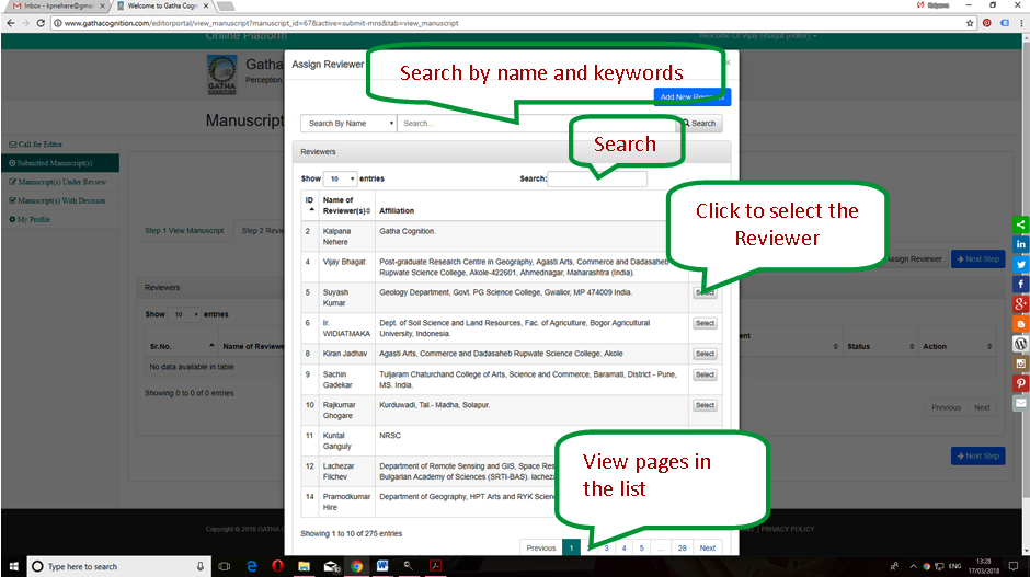 - Search reviewer: 1) by name, 2) by keywords, and 3) direct search.