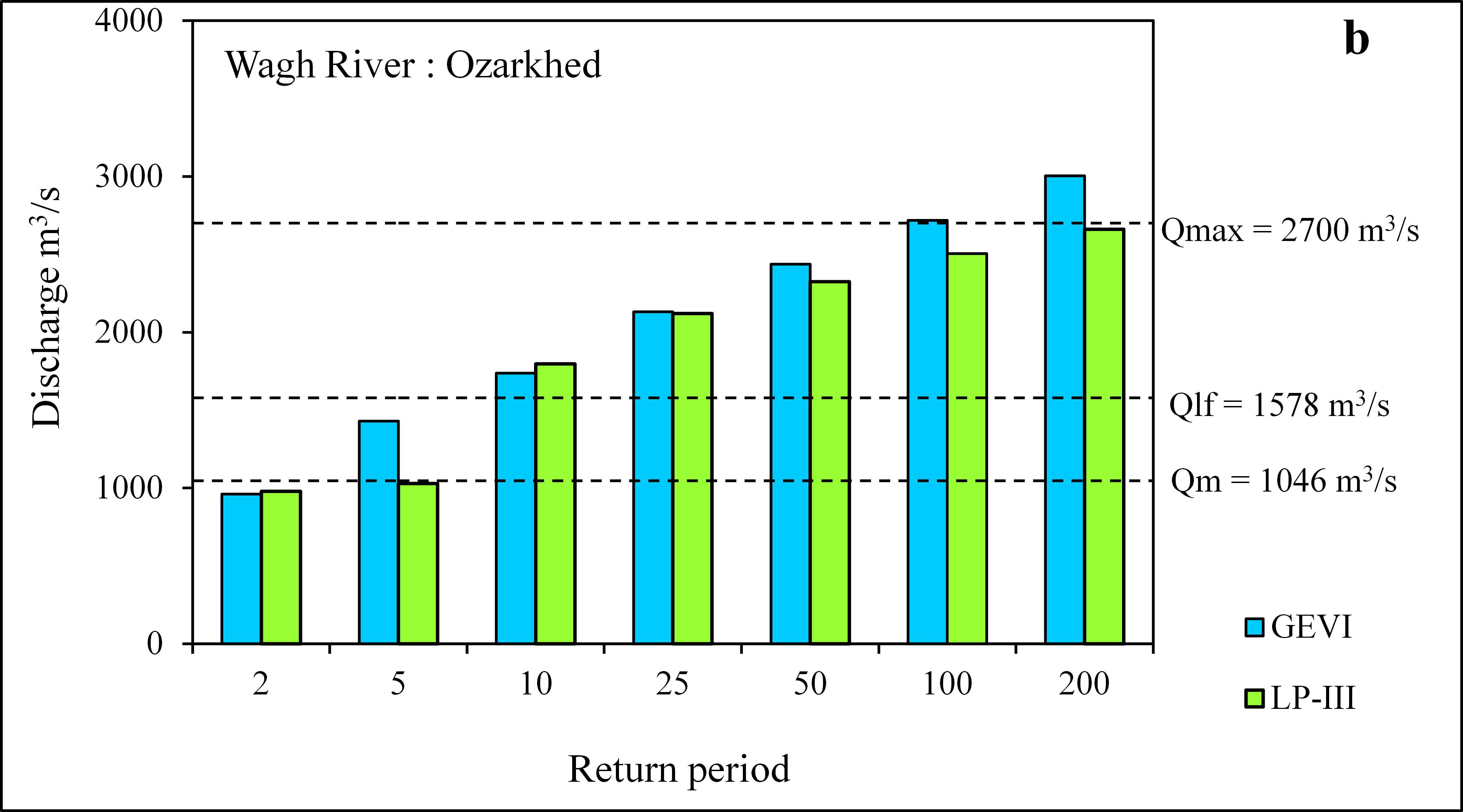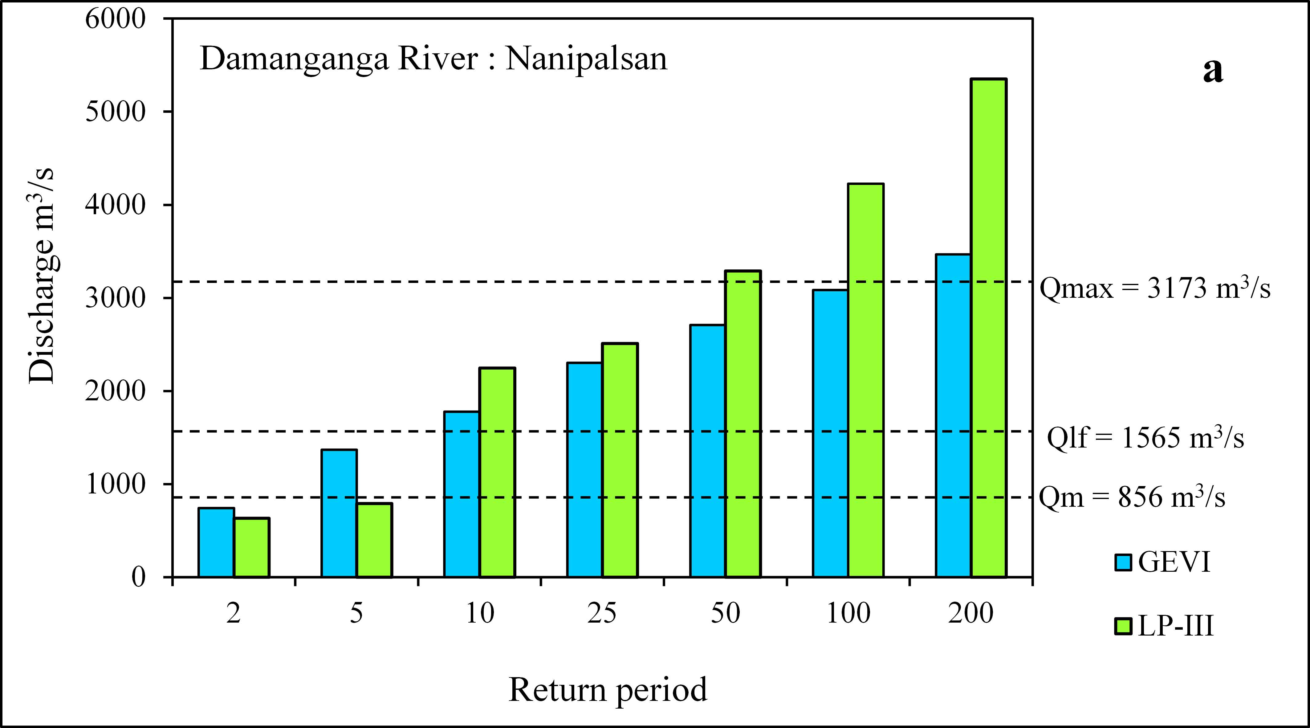 Table 5. Estimated return period for Qm, Qlf and Qmax for gauging sites in the Damanganga Basin based on GEVI and LP-III probability distribution