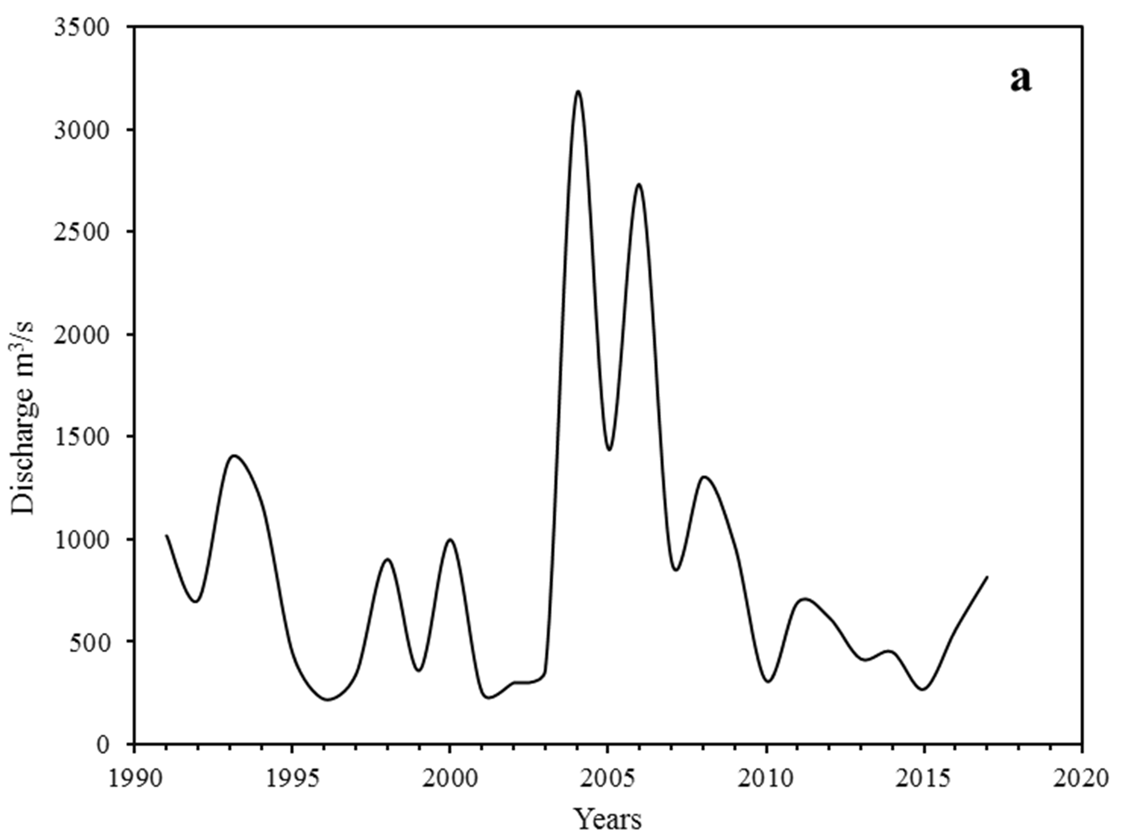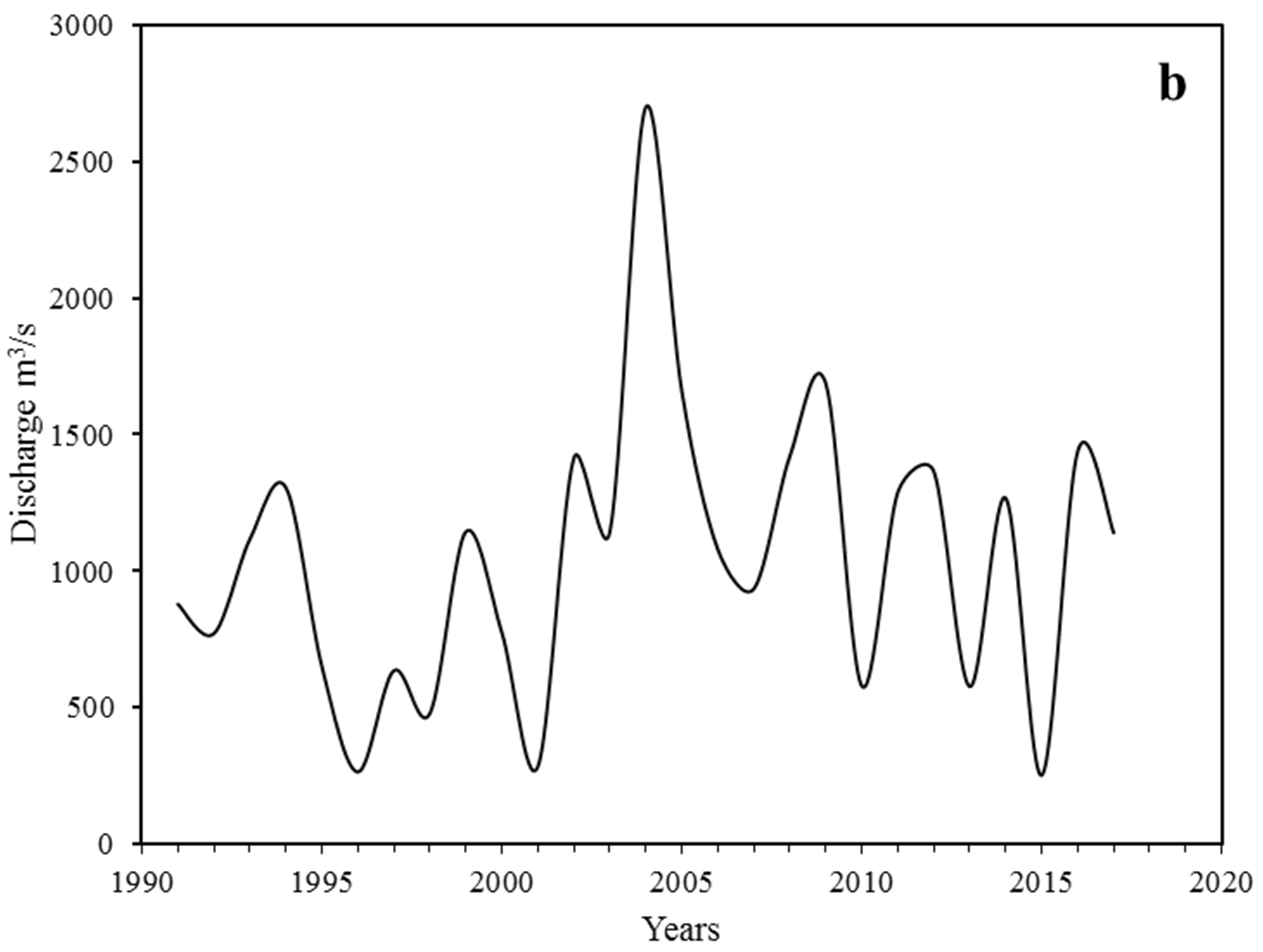 The statistical analysis reveals that the coefficient of variation (Cv) ranged between is 0.83 (Nanipalsan) and 0.51 (Ozarkhed). The highest value of the coefficient of skewness (2.07) of the Nanipalsan site specifies occurrence of the high-magnitude floods during the gauge period in the Damanganga Basin. Further, Qmax/Qm ratio indicates that Qmax (the largest floods during the gauge period) recorded at both sites in the Damanganga Basin was about three-to-four times higher than Qm (mean annual flows) (Table 2). Figure 3a and 3b show a year-to-year variation with one or two large flood peaks throughout the gauge period in the Damanganga Basin.