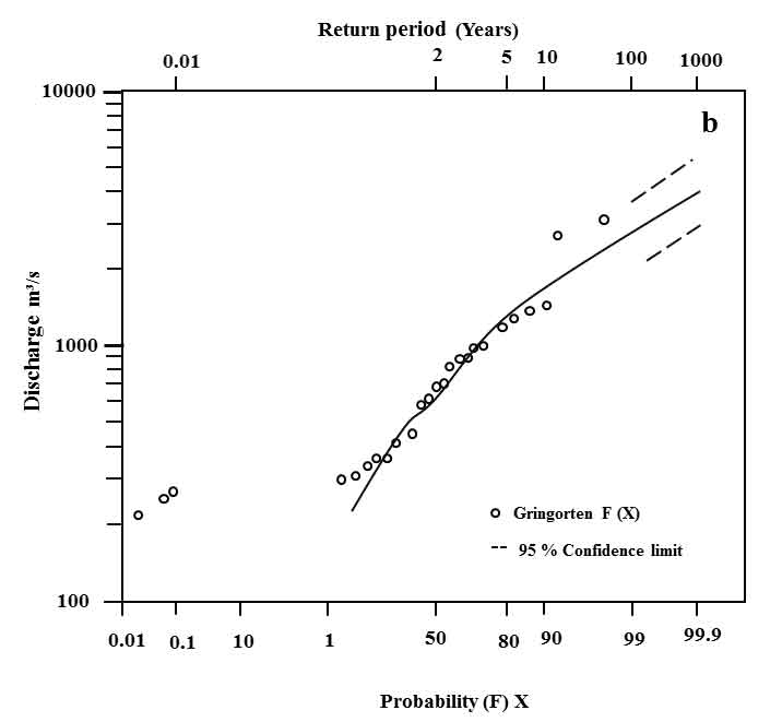 In view of Cunnane (1978) and Shaw (1988), the Gringorten formula for plotting position and frequency curve is the best-fit because the outliers fall into line better than other plotting positions. Therefore, F(X) values were computed by applying the subsequent equations (Gringorten, 1963):