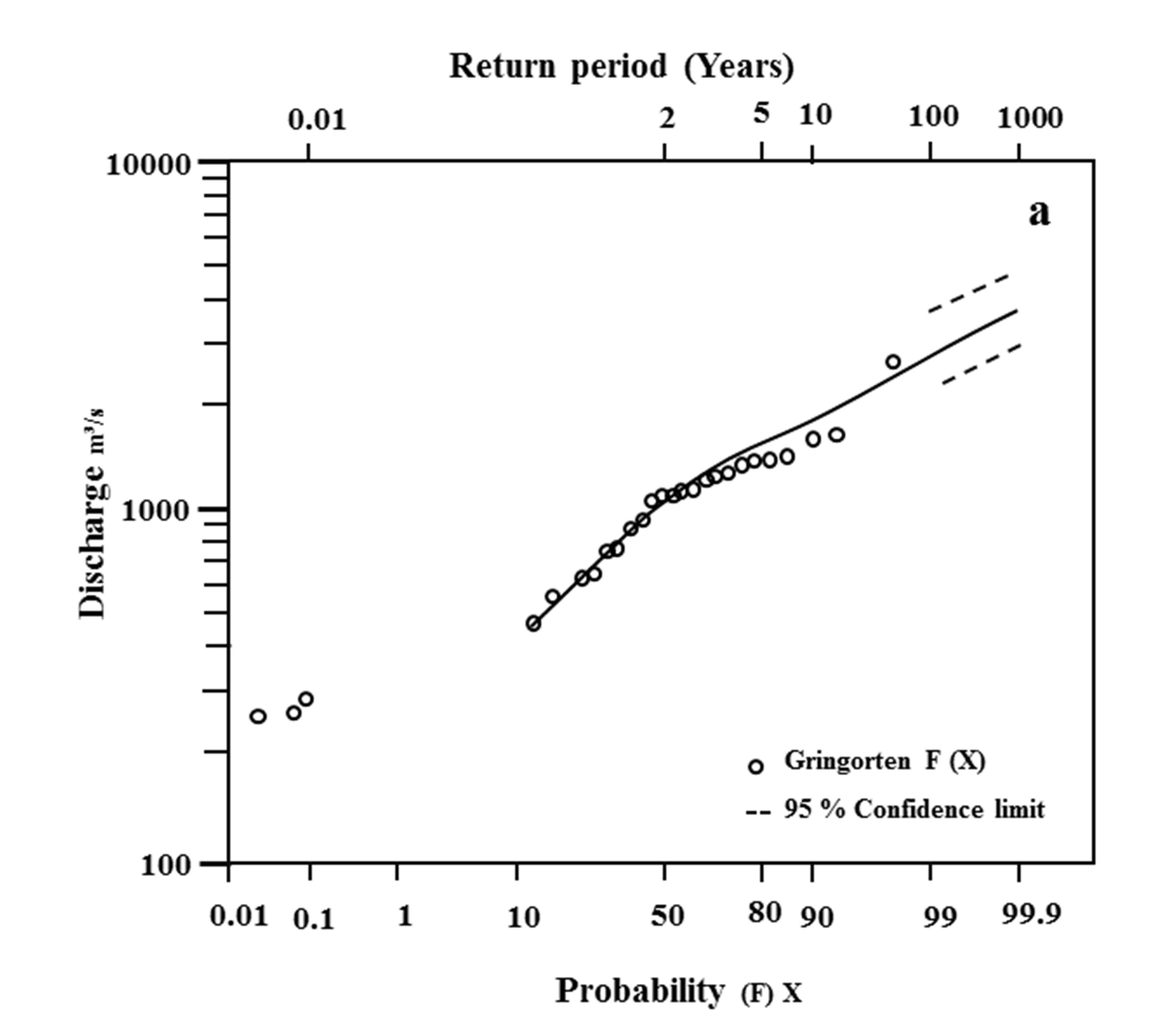 where, F(X) is the probability of an annual maximum Q ≤ X and a and b are two parameters related to the moments of the population of Q values.; e is the exponent. The parameters ‘a’ and ‘b’ were determined by using equations (5) and (6):