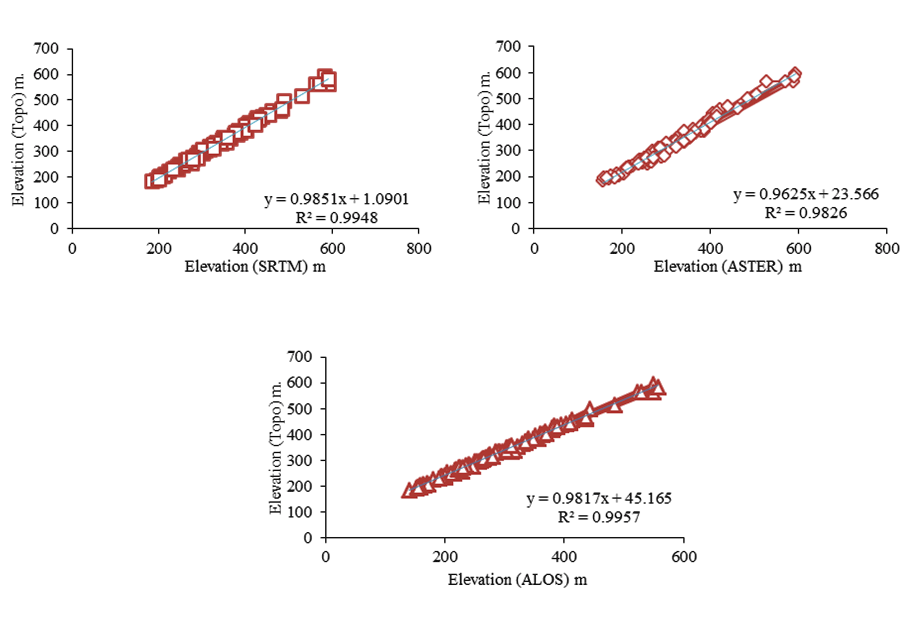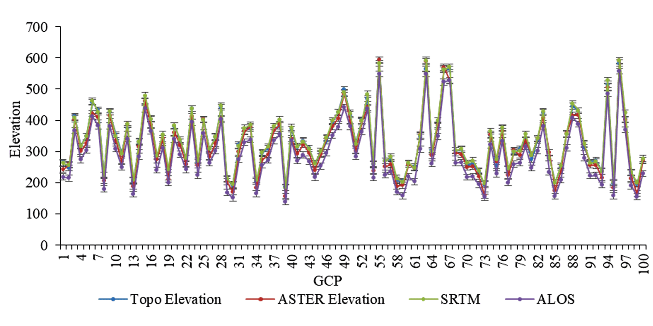 From the analysis, the RMSE of SRTM with respect to Topo-DEM is observed less than ASTER GDEM followed by ALOS PALSAR with 7.98m, 17.4m and 40.3m, respectively. Similar observations have been made as listed in Table 3 for undulated topographical region. The variation in RMS error at different region depends on the topographical features, land use types and geomorphological characteristics within the research area.