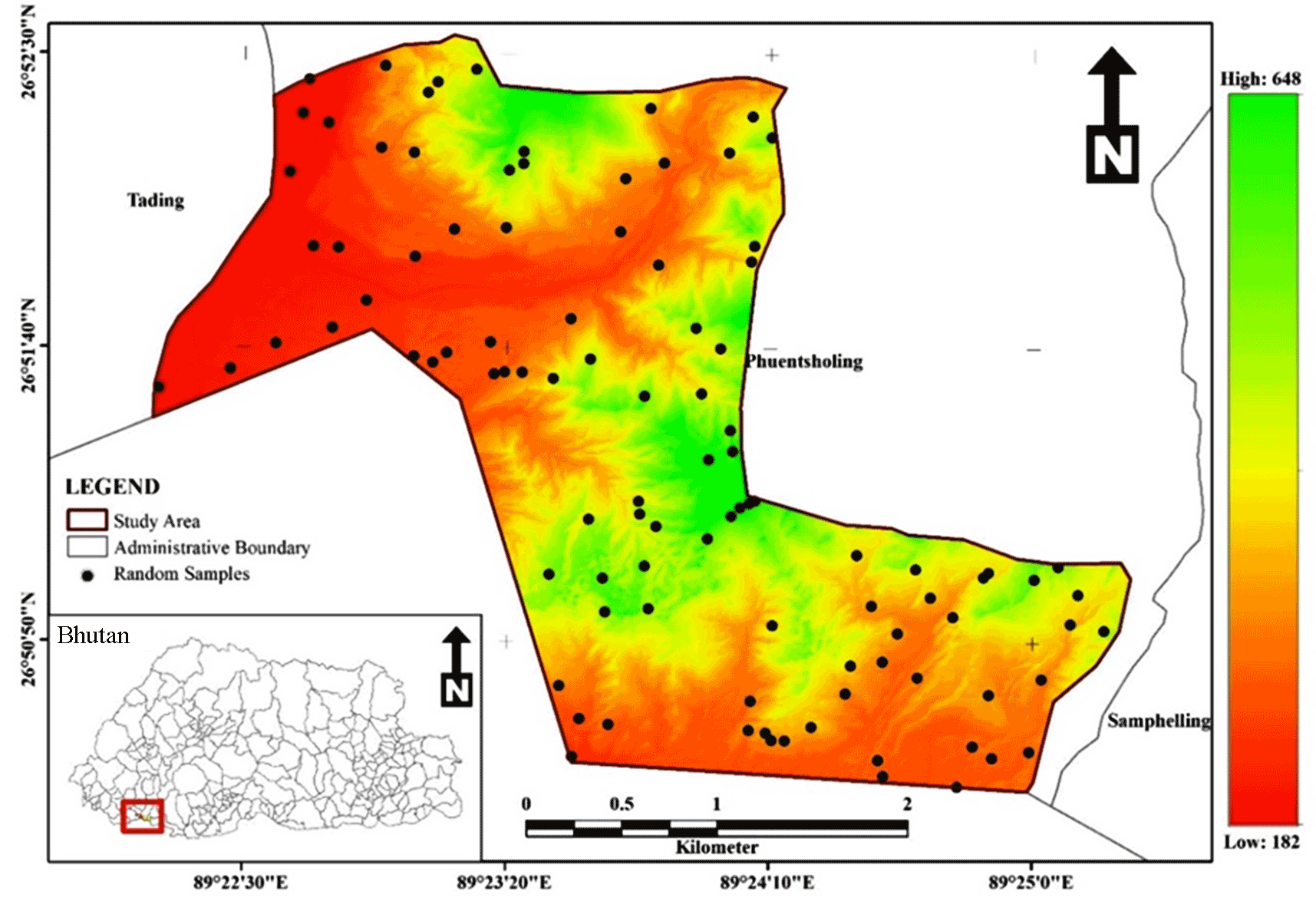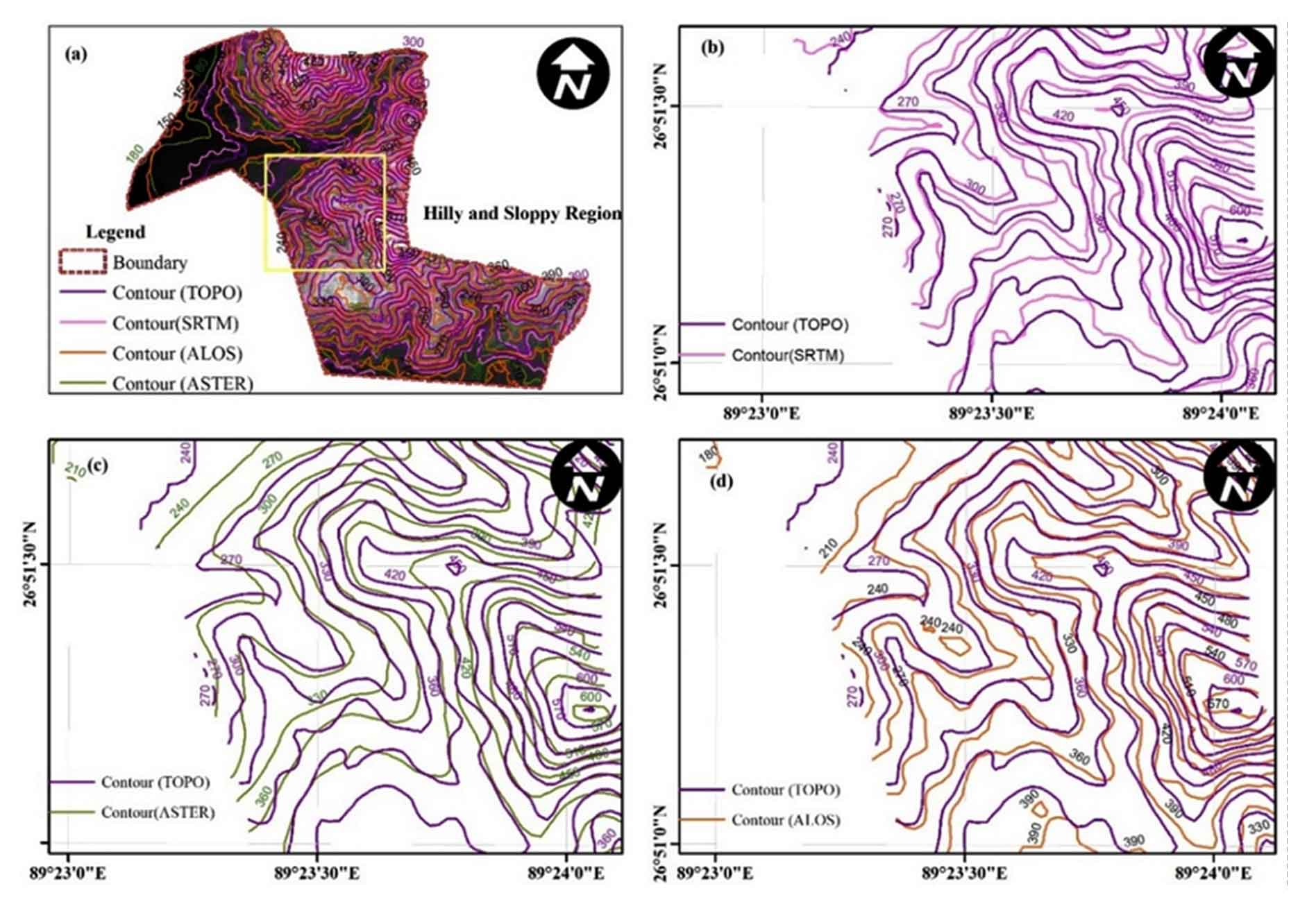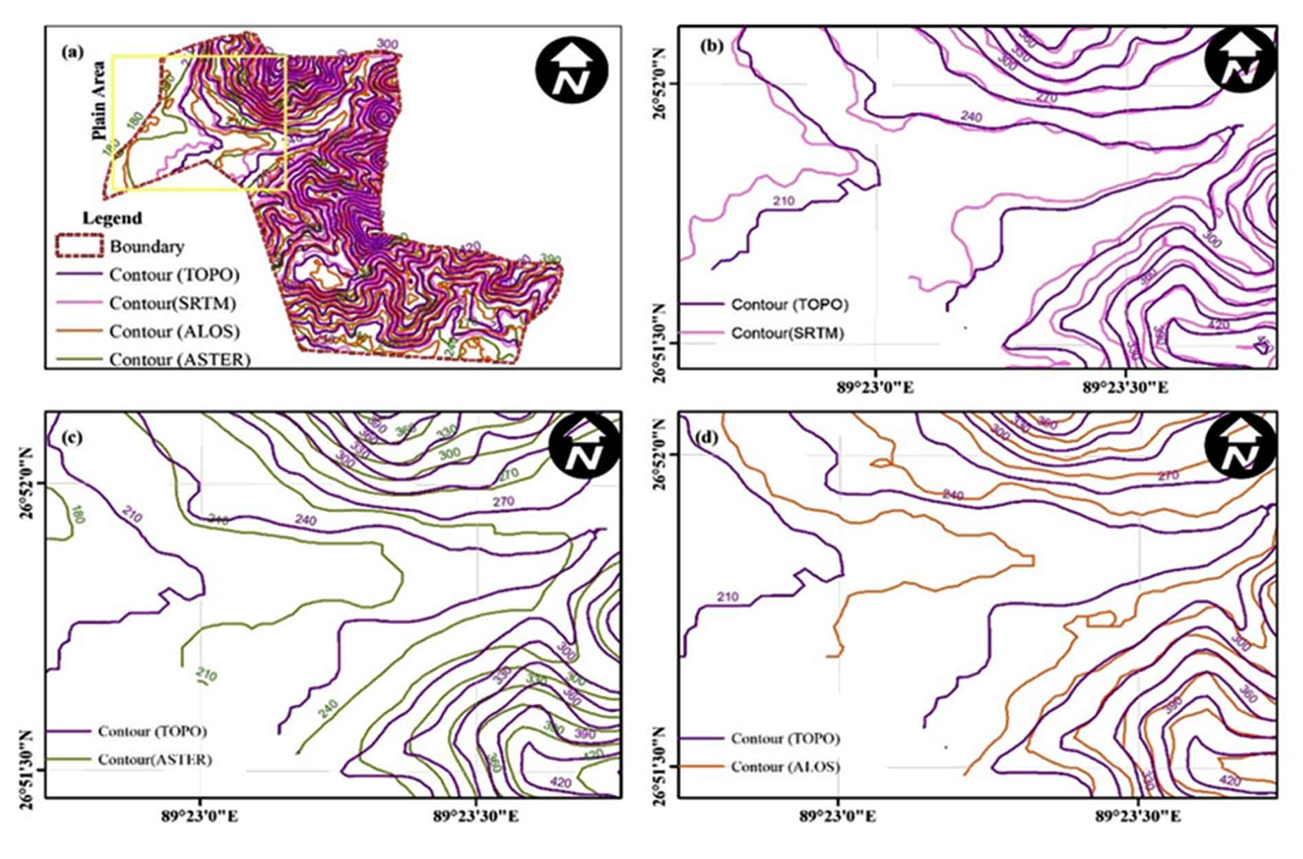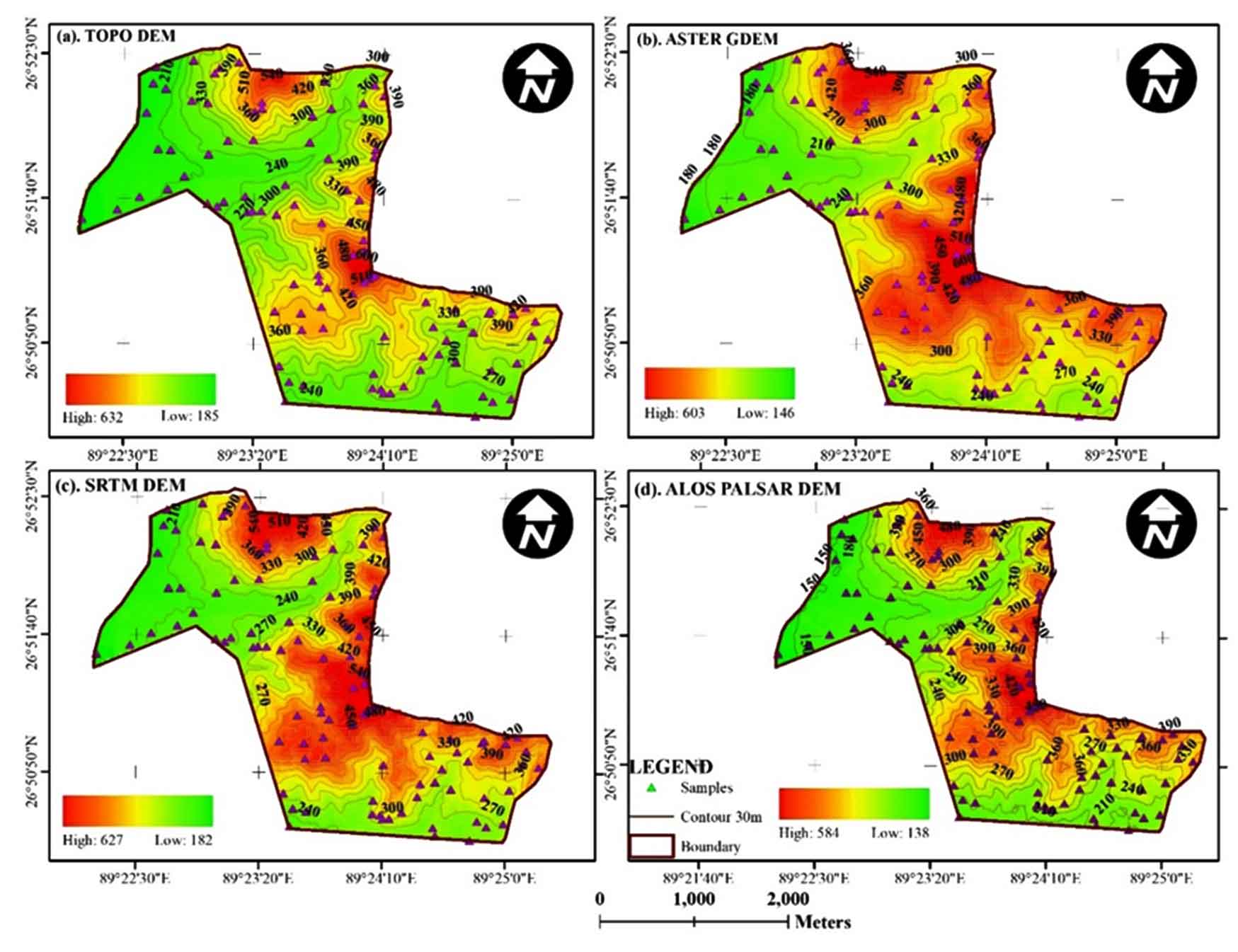 The topographic survey was conducted in 2016 by Phuentsholing City Corporation. 5m contour survey data from topography map was used for generation of digital elevation model of 5m spatial resolution. However, the spatial resolution of SRTM and ASTER GDEM is 30m. Therefore, derived Topo-DEM and 12.5m ALOS PALSAR DEM was further converted to 30m spatial resolution using bilinear convolution techniques to rationalize with other DEMs. 100 randomly distributed samples were gathered using kinematic hand held GNSS receiver to compute the vertical RMSE error of each DEM with respect to Topo-DEM.