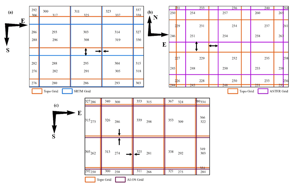 While, considering the horizontal error, the actual shift in pixel reference to the actual position of the pixel on the real ground is crucial and vital to be considered (Jin et al., 2014). The research also found out that the pixel offset in the DEMs are encountered in most of the global DEMs due to the process in georeferencing and DEM generation through photogrammetric technique. The sub-pixel offset measurement was undertaken with the help of Raster to Topo conversion tool in ArcGIS. The pixel of each resolution of \(30 × 30m\) in vector format is extracted to determine the horizontal and vertical pixel offset of each DEMs with respect the Topo-DEM.