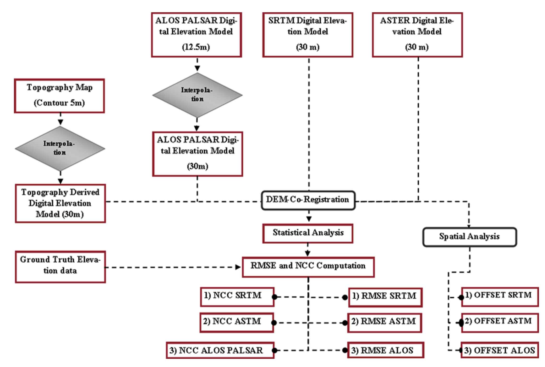 The RMSE, in geospatial domain with regard to the present research defined as difference in elevations of the global DEMs with respect to the high-resolution ground base Topo-DEM derived from topographic map which is represented by equation 1.