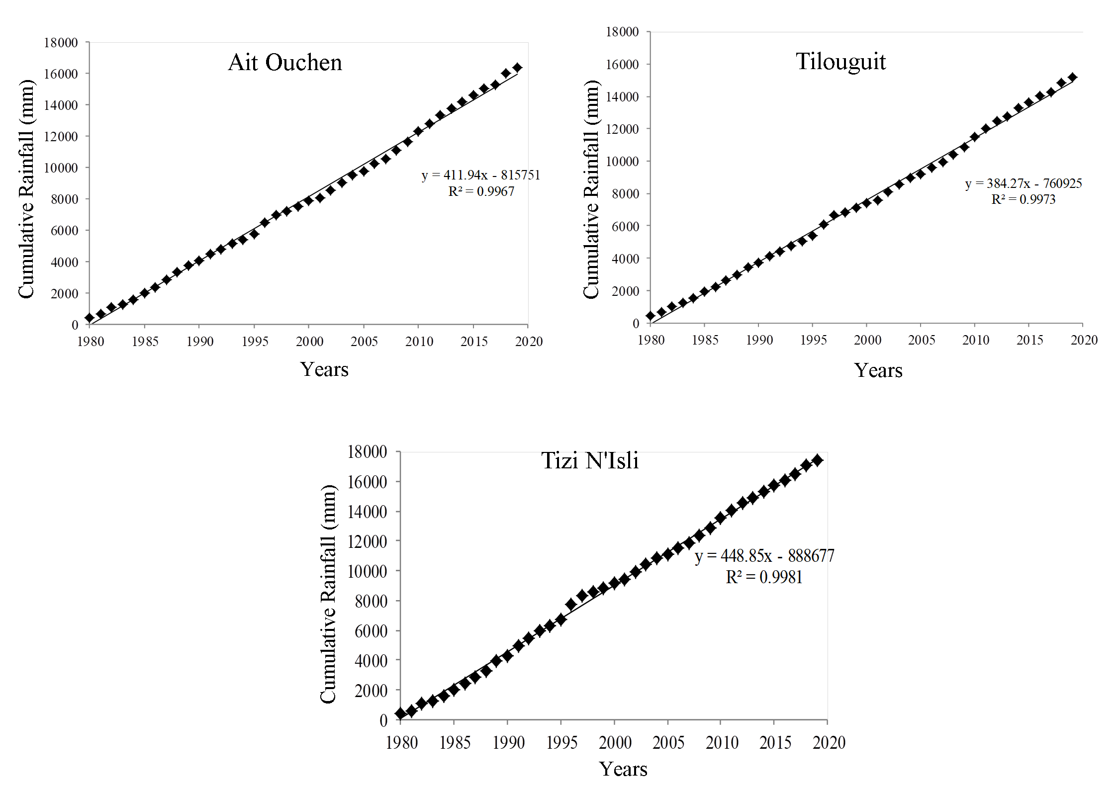 Rainfall data were collected from the Oum Er Rbia River Basin Agency (ABHOER). Tables 2, 3 and Figure 1 present the rainfall characteristics of the selected stations. The database consists of annual rainfall measurements from three rainfall gauging stations Tilouguit, Ait Ouchen and Tizi N'Isli. The choice of these stations is determined by the availability of climate data series. Collected data were used to characterize the meteorological drought in the Oued EL-Abid watershed for the period between 1980 and 2019 (Table 3). To have the quality of the data, the coefficient of determination of the correlation line R² was determined (Elghachi, 2007; Qadem, 2015). When we have an R² greater than 70%, the correlation is considered satisfactory, and an R² greater than 80% the correlation is considered good, then to check the homogeneity of rainfall data, the method of simple (Meylan et al., 2008) and double accumulations were used (Musy and Higy, 2003; Meylan et al., 2008). All stations have an R² exceeding 80% with acceptable significance (Figure 2 and Table 4).