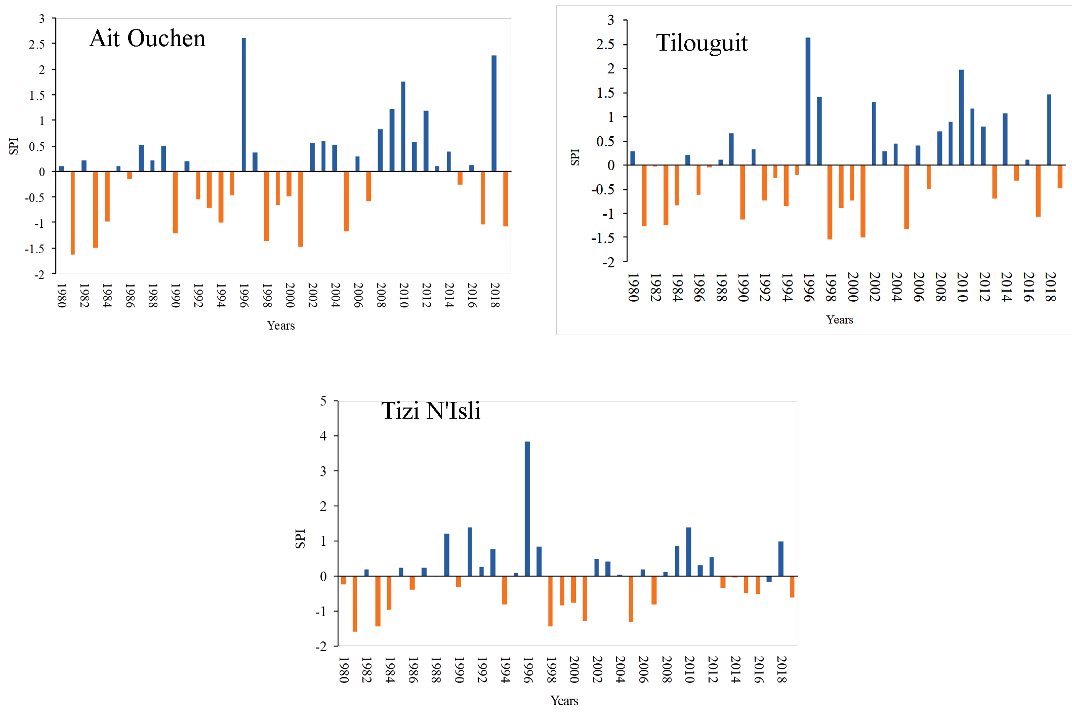 - The calculation of the SPI shows the existence of remarkable dry years of 1981, 1983, 1990, 1994, 1998, 2001, 2005, 2017 and 2019 (Figure 5). This translates into the existence of 7 drought sequences with a peak of about -1.59, -1.63 and -1.54, respectively in the stations Tizi N'Isli, Ait Ouchen and Tilouguit during the year 1981.