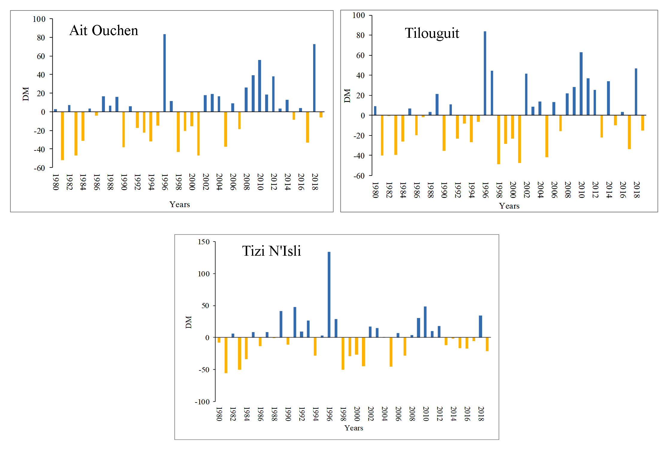 The year is wet when the DM is positive, in contrast to the DM is dry, i.e. a deficit (dry) year when the rainfall is below average and a surplus (wet) year when the average is exceeded. This index has been used by agro-meteorologists to visualize and determine the number of deficit years and their succession.