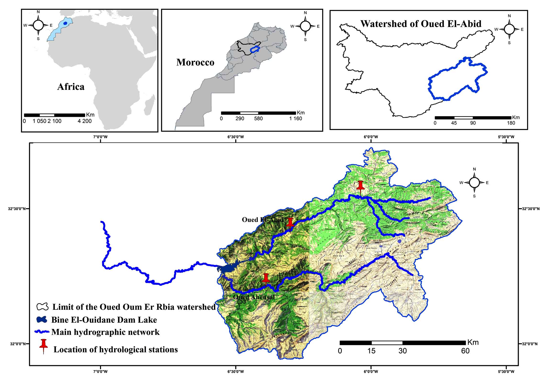 The Oued El-Abid watershed is located in the Beni Mellal-Khenifra region (Central High Calcareous Atlas, Morocco). It extends between (5° 13' 38'' and 6°38'35'' West) longitude and between (31°42'31'' and 32°37'22'' North) latitude. The surface area of the watershed is 6405 km2 at Bin-El-Ouidane lake. The climate is characterized by two contrasting seasons, 1) the hot and dry summer season with high temperatures around 41°C during July and August and the rainy and 2) colder winter season with temperatures around -6°C in January/February. The study area extends over several rural communes such as (Taguelft, Ouaouizeth, Tilouguit, Anergui, Zaouit Ahensal, Imilchil, Anefgou, Tizi Nisli, Aghbala, etc.) (Figure 1). The Oued El-Abid is originate in the jbel Masker (3277 m) and flows from East to West. The basin is elongated, extends in the heart of the High Atlas limestone, bounded on the East and South by a line of high ridges above 3000 m, the highest point of the basin is the jbel Azourki (3690 m) (Leveque, 1952). This basin is drained by two main rivers: Oued Ahensal and Oued El-Abid, the two principal sources of water that feed the dam of Bin El-Ouidane. The dam has a very important role in the irrigation of the agricultural perimeter of Beni Moussa and Tassawt Aval (Irrigation of more than 69500 ha of the plain of Tadla, perimeter of Beni Moussa, on the left bank of the wadi Oum Er Rbia), the supply of drinking water, the production of electricity (2/3 of the national production) and the recharging of aquifers of Tadla downstream (Figure 1), (Ahbari et al., 2017; Ouakhir and Elghachi, 2018). The basin upstream of the Bin El-Ouidane dam lake consists, essentially, of the Dogger and Lias terrains represented by limestone and marlstone formations, Cretaceous terrains represented by marlstone and sandstone formations (Dahani and Aounini, 2013).
