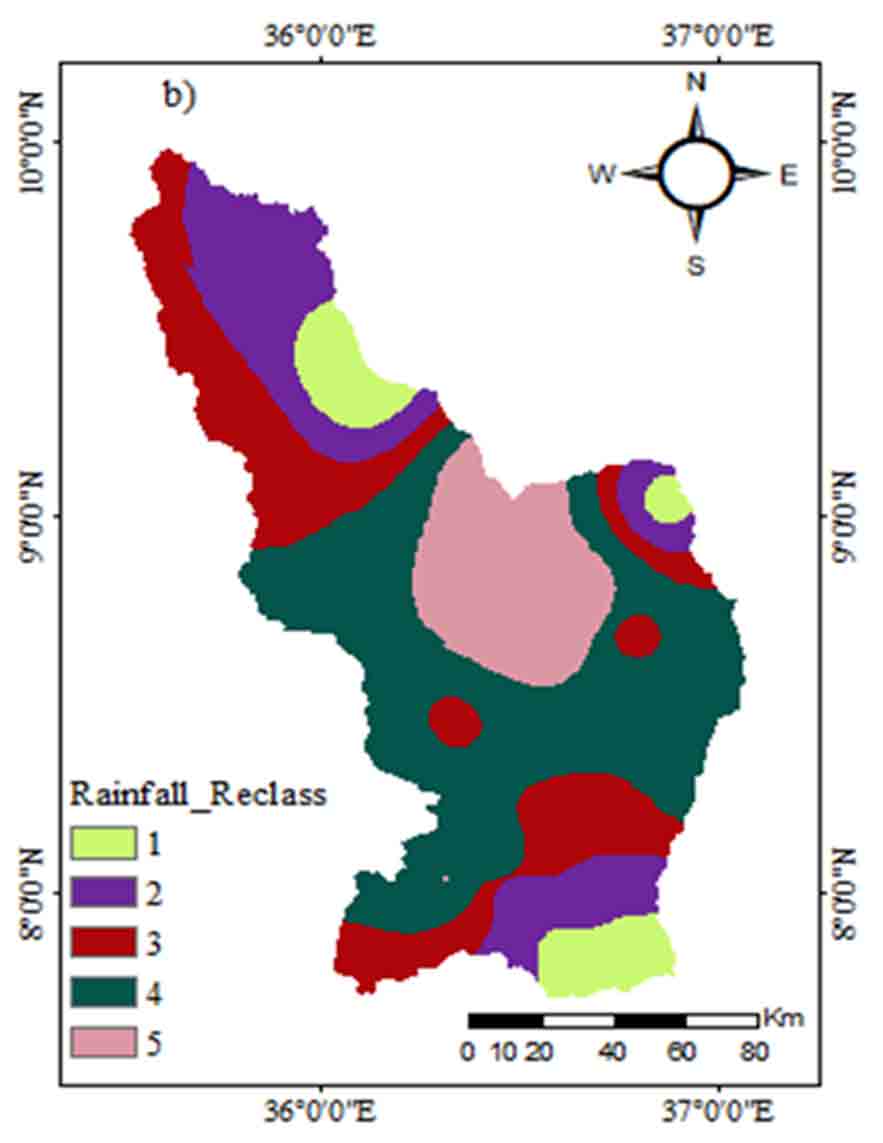 Rainfall is the most important factor for the identification of groundwater potential (Duan et al., 2016). The central and northeastern parts of the study area receive very high rainfall of around 1965-2120mm/year; the most central part receives high rainfall of around 1878-1965mm/year. The northwestern and southern parts receive moderate rainfall 1811-18187mm/year. The Northeastern and few eastern parts of the study area receive low rainfall 1713-1811mm/year. The little eastern southeastern and southern parts receive very low rainfalls (1510-1713mm/year). The high rainfall distribution along high slope gradient in the northwest and southeast highland parts directly affects the infiltration rate groundwater potential zones in the downstream central rift floor of the study area. Based on the mean annual rainfall and its contribution to groundwater potential; the relative weight was given for each rainfall class. The rate was determined by the contribution to groundwater potential; high rainfall areas received a greater weight (Figure 3), while low rainfall areas received the lowest weight indicating low groundwater potential.