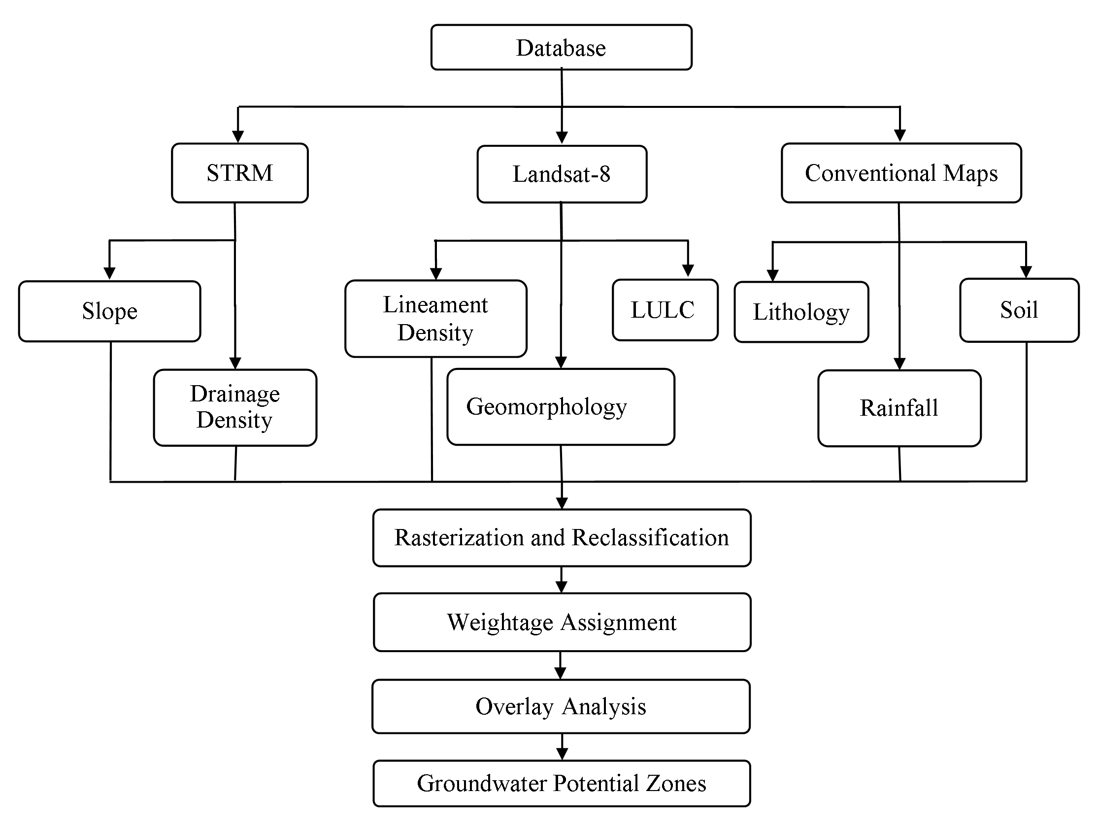 GIS and remote sensing techniques were applied to delineate the groundwater potential of the Didesa sub-basins through the AHP. The methodology used in this work includes the stages: i) identification and evaluation of criteria, ii) data collection, iii) preprocessing, iv) input dataset, vi) reclassified input layers, vii) pairwise comparison of criteria and give weight with AHP, and x) overlay analysis with weight sum overlay analysis in ArcGIS tools and ranking the final value (Figure 2). The long-term average point rainfall values were used to generate areal rainfall map. IDW interpolation approach was used to interpolate the areal rainfall map. Twenty-three stations data were employed for the preparation of areal rainfall of the study area. In this study, data sets such as SRTM data, Landsat-8, and geological data of the study area is identified and used as input data sets for further processing. SRTM at 30 X 30m resolution was used to generate digital elevation model of the area. Landsat images have been used for the preparation of LULC, lineament density and geomorphology maps. Then the elevation map of the Didessa sub-basin was prepared using Arc GIS. Further, the elevation data was used to generate the slope raster data in each grid cell. In the elevation raster, slope was measured by the identification of maximum rate of change in value from each cell to neighboring cells. The slope classes in the watershed were identified using slope spatial analyst tool in the ArcGIS package. On the other hand, the data related to drainage density were generated indirectly from the watershed slope data. Drainage density is defined as the closeness of spacing of stream channels. Drainage density (Dd) is the measure of the total length of the stream segment of all orders per unit area. The lineaments of the study area were extracted from the Landsat-8 OLI/TIRS image (path 170, row 51 with zero cloud cover) using automated processing LINE tool in PCI Geomatica 2017. Out of the 11 bands of the Landsat-8 OLI/TIRS images, the lineaments were extracted from band 5 due to its quality and the highest number of lineaments delineated. After the lineaments were extracted, further processes of editing the watershed divide line and road features were done in GIS to ensure the quality of the extracted lineaments. The geomorphological map of the study area was prepared following the Hammond landform classification technique.