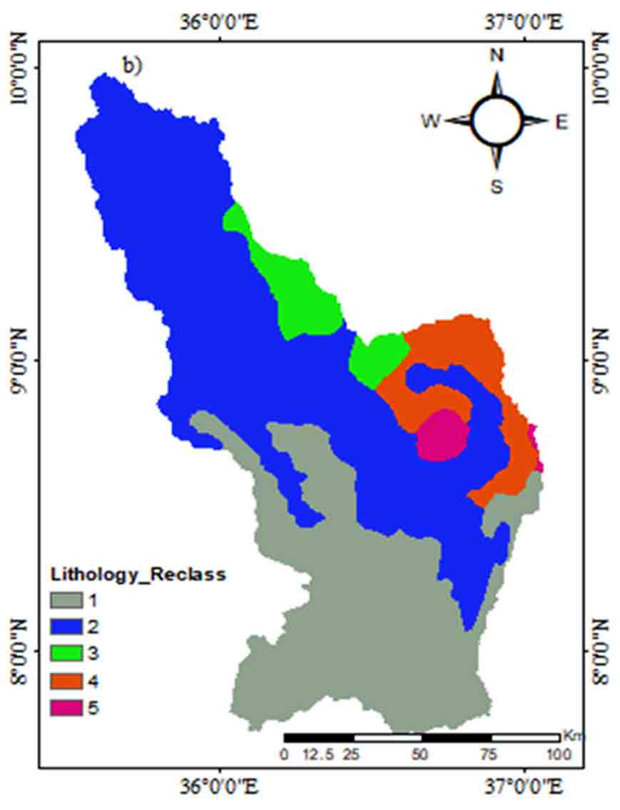 The presence of groundwater in an aquifer is determined by the geological settings’ lithology and permeability. Water is stored in the aquifer when the lithological formation holds and conveys the percolating water. The amount and volume of water stored in the geology is a function of the hydrogeological settings of the area. The water can only be stored if there are enough void areas between the geologic units. The aquifer is assumed to be potential when there are enough spaces in the hydrogeological settings. Porosity and permeability are frequently sufficient in lithological units with uniform grain sizes. Groundwater recharge occurs when precipitation from surface runoff lakes and streams percolates into the subsurface. The study area’s dominant lithology classes are Termeber, Adigrate Sandstone, Blue Nile Basalts, Marshsoils, Fluvium, Colluvium and Lateritecon Amba Alija Rhyolite, and the corresponding classes to the groundwater potential zones are very poor = 1, poor = 2, moderate = 3, high = 4 and very high = 5, respectively (Figure 10).