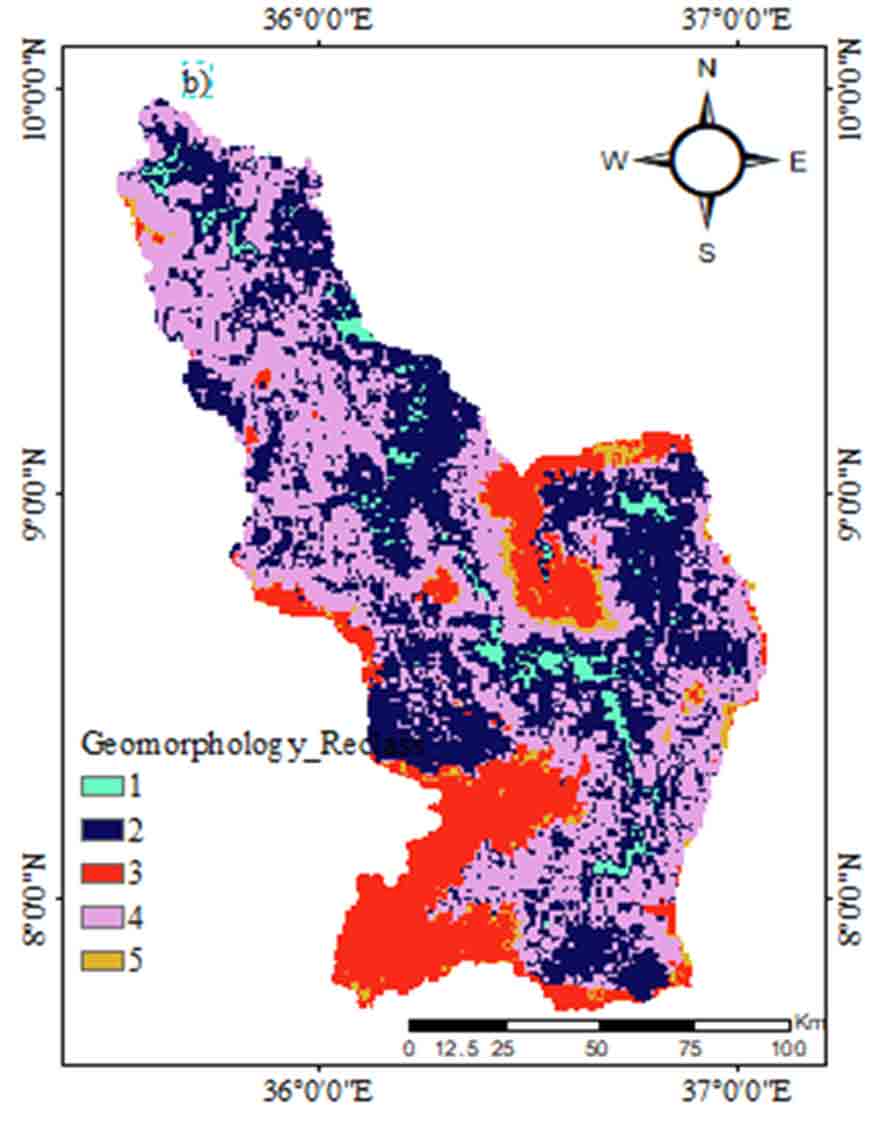 Geomorphology is the study of earth structures and landforms. It mainly depends on geological formation. From a geomorphological study point of view, the identification and characterization of diverse landforms and structural elements in the study region are very significant as they are required for groundwater potential. If the hydrogeological settings convey water for a geomorphological unit a slope based landform, low mountainous, and flat plains are markers for the presence of groundwater. The geomorphological map shows seven landform features namely: High altitude plains, Low plateaus, Mid altitude plateaus, High-altitude plateaus, Low altitude mountains, Mid altitude mountains, and High altitude mountains. These geomorphologies were reclassified into five units (Figure 9) as very poor = 1 (high mountains), poor = 2 (Hills), moderate = 3 (low mountains), high = 4 (plateaus), and very high = 5 (plains) based on the rate of groundwater recharge.