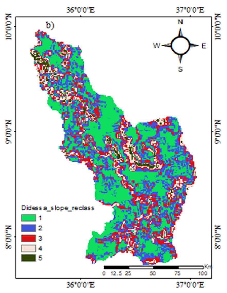 The slope is the steepness or the change of elevation between two locations and it has a direct influence on groundwater recharge. High slope regions have high runoff and low infiltration rates that are not suitable for groundwater recharge, because water cannot get enough time to infiltrate to the ground The slope map of the study area was prepared based on the DEM data using the spatial analysis tool in ArcGIS 10.7. Based on this result, the slope of the study area was divided into five classes namely; flat, gentle, moderate, high, and steep slope. The generated map was reclassified (Figure 6) and ranking depend on their groundwater potential and recharge influence. The highest rank was given to flat slope because the flat area can hold water which is very easy for infiltration of water to the ground and the lowest rank was assigned for the steep slope. After all, they result in high runoff and low infiltration which cause low groundwater recharge. For this study, the slopes were reclassified into five categories to groundwater potential zones as very high = 5 (0 - 2.024), High = 4 (2.024 - 3.898), Moderate = 3 (3.898 - 6.297), Poor = 2 (6.297 - 9.82) and very poor = 1 (9.82 - 19.116).