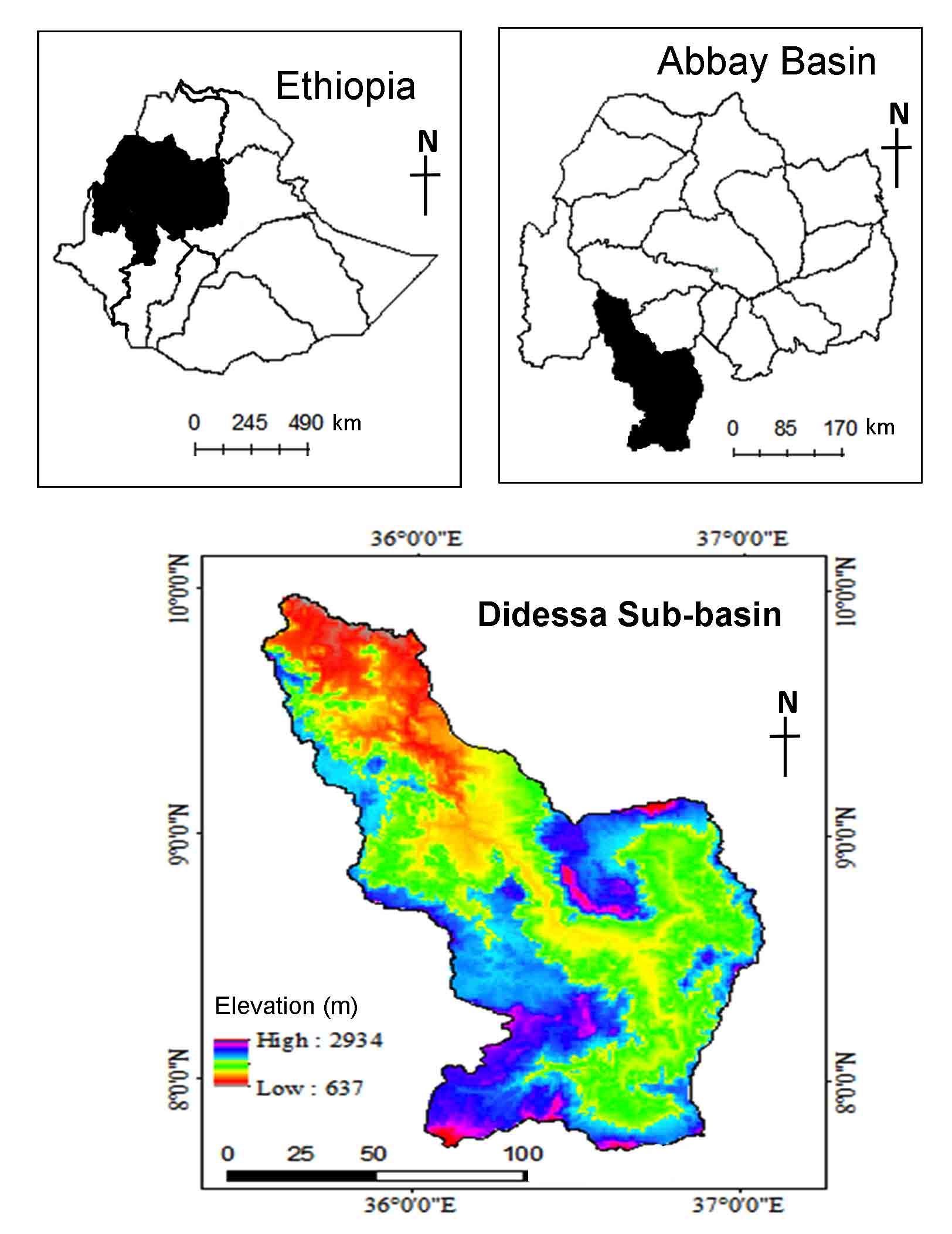 The Didessa sub-basin is the largest among the major sub-basins in Abay Basin in terms of its annual discharge (Kabite and Gessesse, 2018). In the Blue Nile basin, the Didesa sub-basin is the most important both hydrologically and physiographically. The Nile basin, which has supported millions of people since prehistoric times, receives around 60% of its yearly discharge from the blue Nile river, with the Didessa river accounting about 25% of that discharge (Kabite and Gessesse, 2018). The Didesa sub-basin is located in western Ethiopia, and it encompasses the East and West Wollega zones, the Illubabor zone, the Jimma special zone of the Oromiya area, and some parts of the Kamashi zone of Benishangul Gumuz. Geographically the sub-basin is located between 7º and 9ºN and 35º and 36ºE in the western part of Ethiopia. The elevation in the basin ranges between 654m MSL and 3154m MSL. The river drains an area of 28092km2, and the Didessa River, which is the blue Nile’s greatest tributary, contributes nearly a quarter of the river’s total flow. In the research region, the average annual rainfall is around 1745mm. The river basin is classified under a humid tropical climate with heavy rainfall with an annual amount that is mainly received when the weather is wet. The highest and lowest temperature ranges between 21 and 31ºC and 10 and 15ºC, respectively. Geologically, Didessa sub-basin is dominated by Jimma Volcanic and the central part with Wellega Basalt and the lower parts are dominated by undifferentiated lower complex, Wellega Basalt and Adigrat Sand Stone.