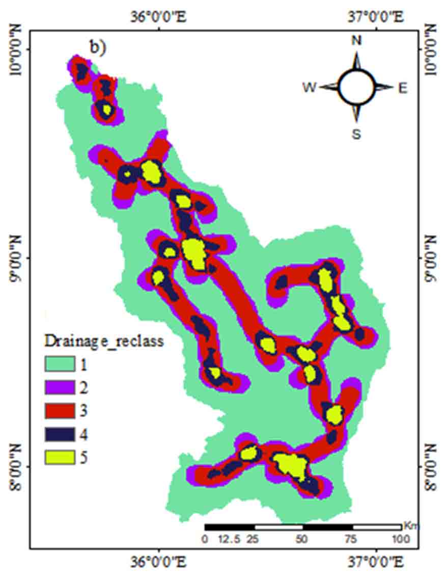 In this study, eight thematic layers (drainage density, rainfall, slope steepness, LULC, lineaments density, soil, geomorphology, and lithology) were used. The rainfall map was prepared using Inverse Distance Weighting (IDW) interpolation of long term mean annual rainfall data recorded at 23 stations. The information of lithology and soil are collected from the Ethiopian Geological Survey. These thematic layers were prepared with the help of ArcGIS 10.7 platform. The drainage and lineament density maps have been prepared using the line density analysis tool in Arc GIS 10.7. The slope and drainage density were derived from the Shuttle Radar Terrain Mapping Digital Elevation Model (STRM DEM) of 30m resolution. Landsat-8 Operational Land Imager (OLI) satellite images were obtained from the United States Geological Society (USGS) website and used to generate the lineament density and LULC maps.