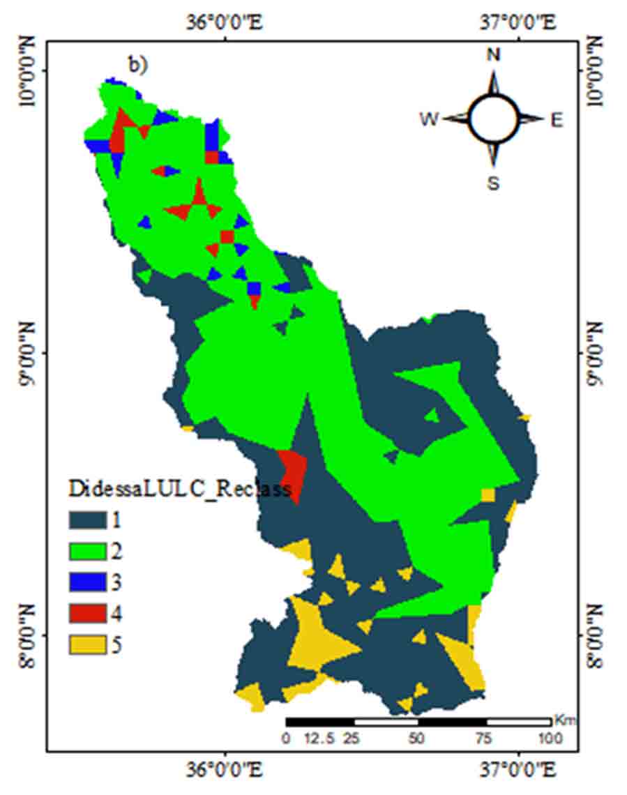 LULC have a direct effect on the hydrological process of surface runoff, evapotranspiration, and groundwater potential. LULC types give the necessary information on infiltration. Water body, agricultural land, and the waterlogged area are excellent sources of groundwater potential, while the bare lands and exposed rock surface areas are less important for groundwater potential. A LULC map was prepared using supervised classification with a maximum likelihood classification from Landsat-8 Operational Land Imager (OLI) Satellite images. Seven dominant LULC namely dominantly cultivated land, shrub land, grassland, dominantly cultivated land, bare land, woodland, and forest are available in the study area. These land use land covers were reclassified into five classes (Figure 8) based on qualitative categories as very poor = 1 (Bare land), poor = 2 (Agricultural land), moderate = 3 (Woodland), high = 4 (Grassland), and very high = 5 (Forest) based on the rate of groundwater recharge.