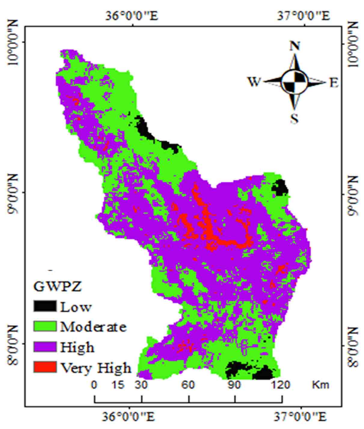 Rainfall, slope, lineament density, and geomorphology hold the highest value relative to the other parameters. The weight assigned for rainfall was greater than the weight of others, which influence the occurrence of groundwater potential and recharge zone than other parameters. The result indicated that about 2.1% of the study area classified (Figure 11) as low 27.35% classified as moderate, 66% as high potential, and 4.6% were classified as very high groundwater potential.