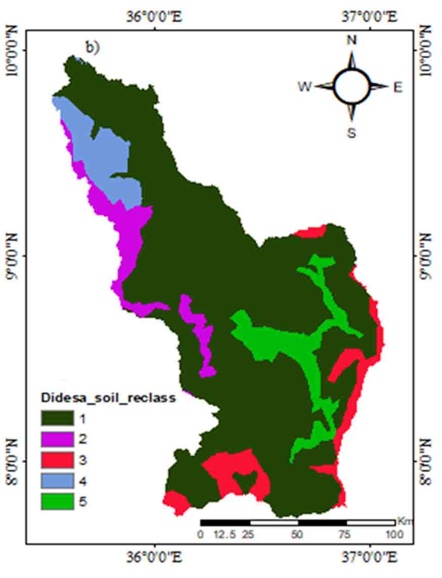 Soil is an important factor for delineating the groundwater potential areas. The percolation or infiltration rate of water to the water tables is influenced by soil permeability. Didessa sub-basin is covered by a variety of soil groups. the major soils are Hunitisols which covers (73.77%) and are highly characterized by loam in texture, Hpnitisols (4.66%) with clay texture, Ltleptosols (1.48%) characterized by sandy loam, Hualisols (7.03%), which is loam in texture, Rhnitisols (0.03%) with heavy clay texture character, Dyleptosols (5.73%) which is loamy sand in their texture and Euvertisols (7.3%) characterized by clay texture. The Soils were reclassified into five categories (Figure 7) for groundwater potential zones as very poor = 1 (Heavy clay), poor = 2 (clay), moderate = 3 (loam), high = 4 (sandy loam) and very high = 5 (loamy sand).