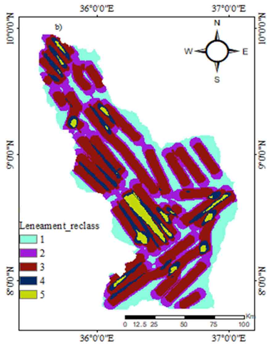 Lineaments are the simple and complex linear properties of geological structures. The Geomatica module was used to extract faults, cleavages, fractures, and various surfaces of discontinuities such as terraces and ridges arranged in a straight line or a small curve that are identified by remote sensing lineaments extracted from a single image of Principal Component Analysis (PCA) and record the output as a polyline with vector segment (Tadesse et al., 2015). Due to multispectral imaging bands being often highly correlated, Principal Components used to produce uncorrelated output bands, segregate noise components, and reduce the dimensionality of data sets. This is accomplished by finding a new set of orthogonal axes with their origin at the data mean and which are rotated to maximize the data variance. Landsat images were processed for Principal Component Analysis and eight-bit grayscale lineaments are automatically extracted. Groundwater potential is to be good in areas with a high lineament density. The lineament density was classified into five categories (Figure 5) classified as very poor = 1 (0-0.03234 km/km2), poor = 2 (0.03234-0.08407 km/km2), moderate = 3 (0.08407-0.1304 km/km2), high = 4 (0.1304-0.1767 km/km2) and very high = 5(0.1767-0.2748 km/km2). The large parts of the study areas are classified as moderate lineament density.