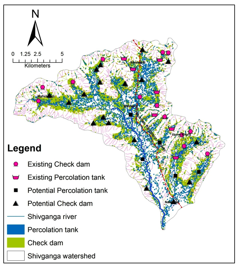 Area suitable for check dam construction is present in the source and middle part of the watershed, however, the area suitable for percolation tanks are present at lower reaches of the watershed. Hence, there is ample scope for construction of SWC structure in the study area. The potential zones for recharge structures such as percolation tanks and check dams were identified as presented in Figure 4.