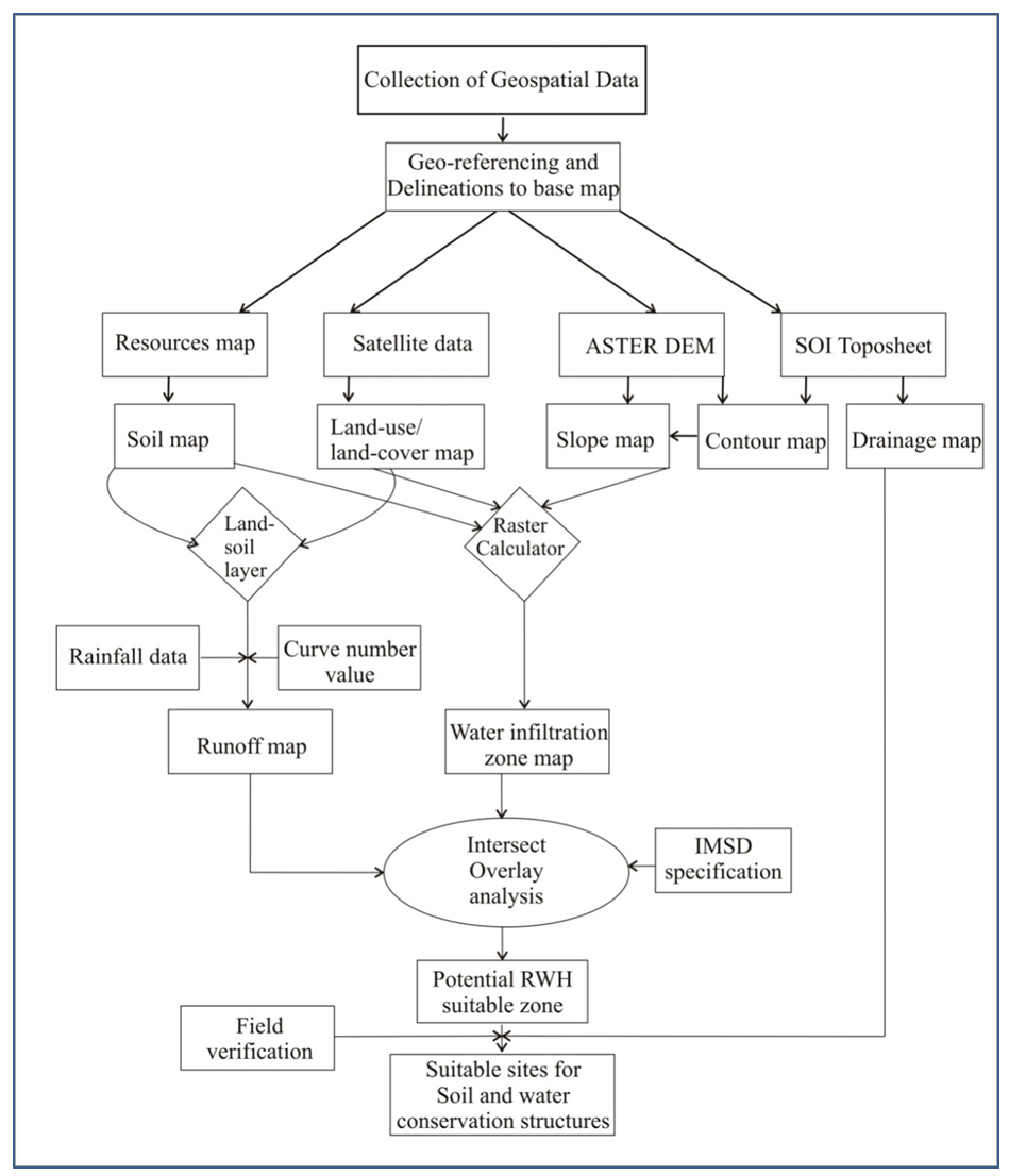 Various methods have been used to obtain direct or indirect information about soil water conservation and its potential occurrence, within that hydrogeological and geospatial analysis are commonly used and seems to be popular. Geospatial and hydrogeological analysis include several spatial layers of topographies that affect the soil water conservation structures (slope, soil, drainage, land use and lineament) (Kadam et al., 2012; Napoli, et al. 2014; Mahmoud and Alazba, 2016). The present study aims to identify the possible soil-water conservation sites with a new approach of hydrospatial information along with the geospatial analysis.