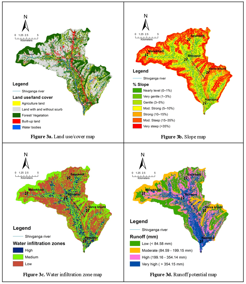 Figure 3c shows that major portion of the study area can be categorized under moderate to low category and remaining area falls under high categories. Thus, SWC structures are proposed to construct in order to enhance both sub-surface and surface storage.