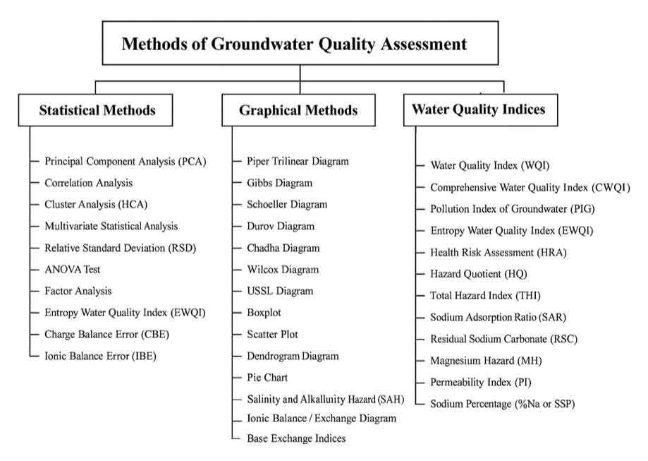 Piper trilinear diagram, Schoeller diagram, Wilcox diagram, Dendrogram diagram, Cluster analysis