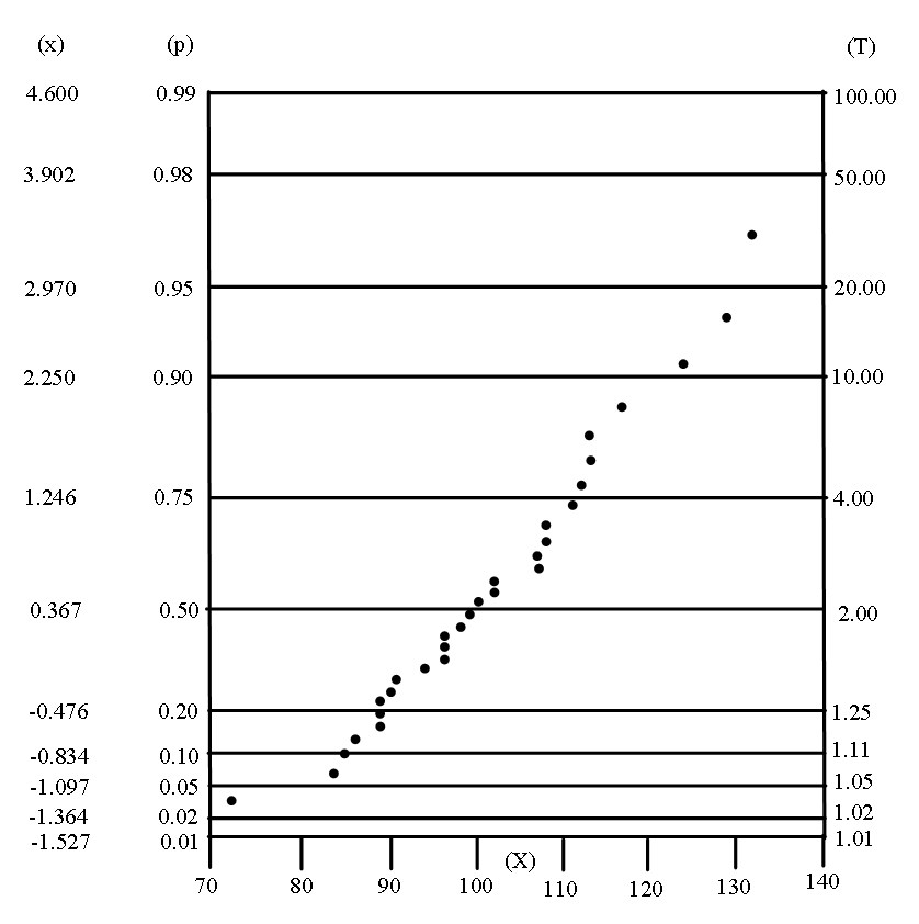 For the plotting we must know \(\mathrm{ x_{ \left[ .367n \right] +1}^{̓}=x_{12}^{̓}=96 }\) and \(\mathrm{ x_{ \left[ .692n \right] +1}^{̓}=x_{21}^{̓}=108 }\) and so the plot in the statistical choice modification of Gumbel probability papers gives the graph Figure 17.1 that follows, agreeing with the use of the Gumbel model.