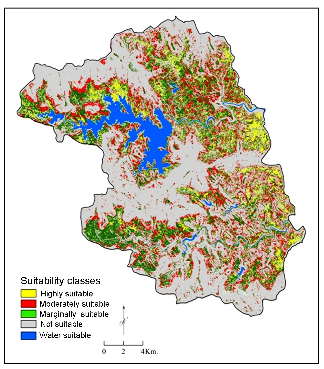 Then output raster map was generated and assigned scores were averagely calculated into four classes i.e. 9, 7, 4 and 1. Lastly, these classes were reclassified basis on FAO (1976) into the four suitability class i.e. highly suitable, moderately suitable, marginally suitable, and not suitable.