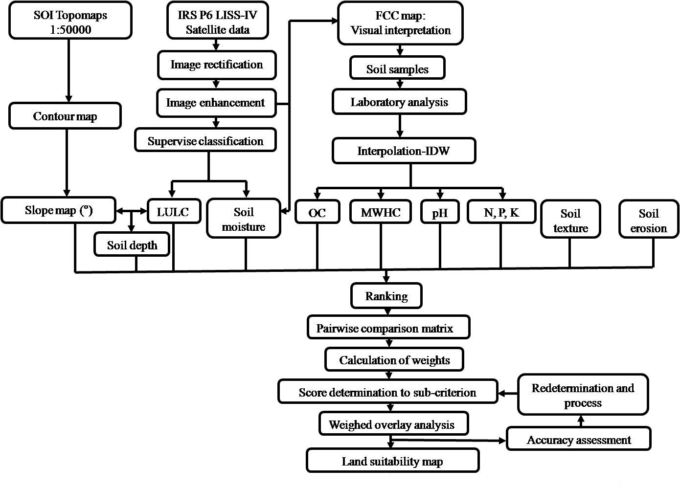 In this study, twelve criterion such as slope, LULC and soil qualities (depth, MWHC, SOC, pH and nutrients) were selected for spatial analysis using weighted overlay analysis (WOA). Thematic maps i.e. pH, EC, OC, N, P and K were prepared using Inverse Distance Weighting (IDW) interpolation technique in GIS. Comparison for Super Decision Software (CSDS) was used for calculation of weights for selected criterion.