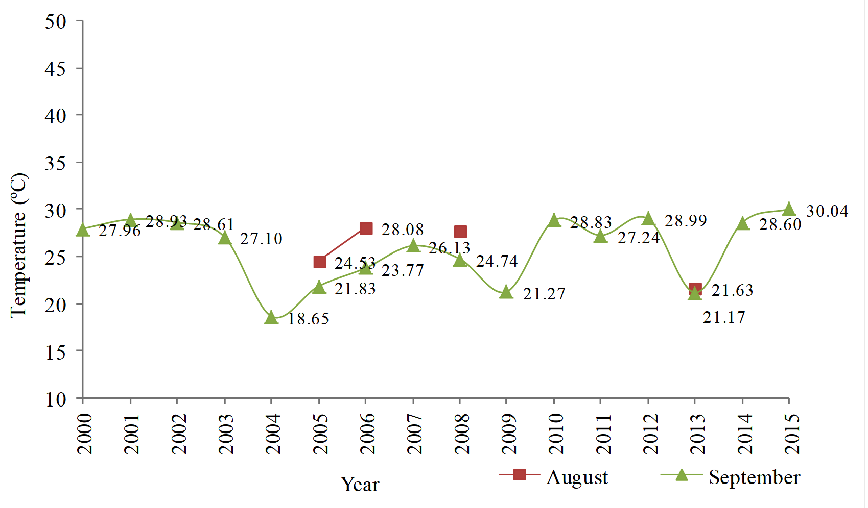 The average day temperature for the month of July and August was not recorded due to cloud cover (Figure 7). September is showing lowest record for the year 2004 and about 30 °C for 2015.