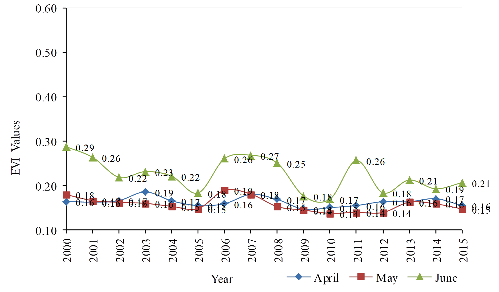 Figure 18. Mean EVI Pixel Value: April to June (2000 to 2015)