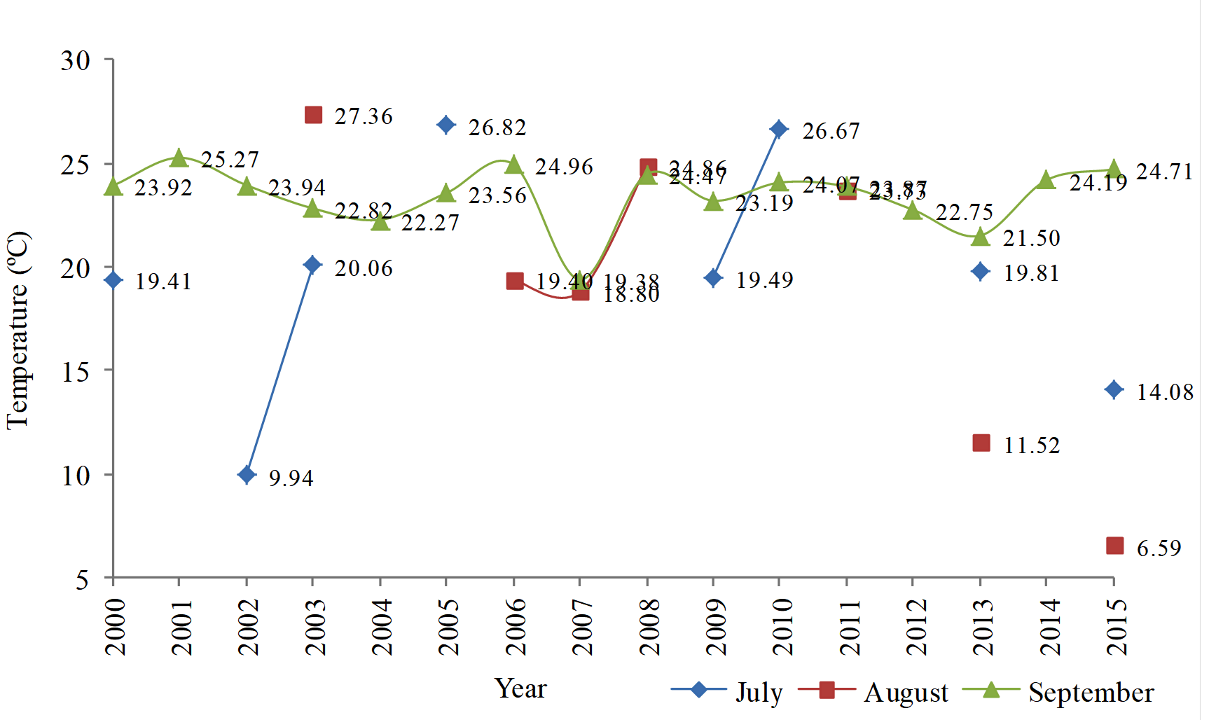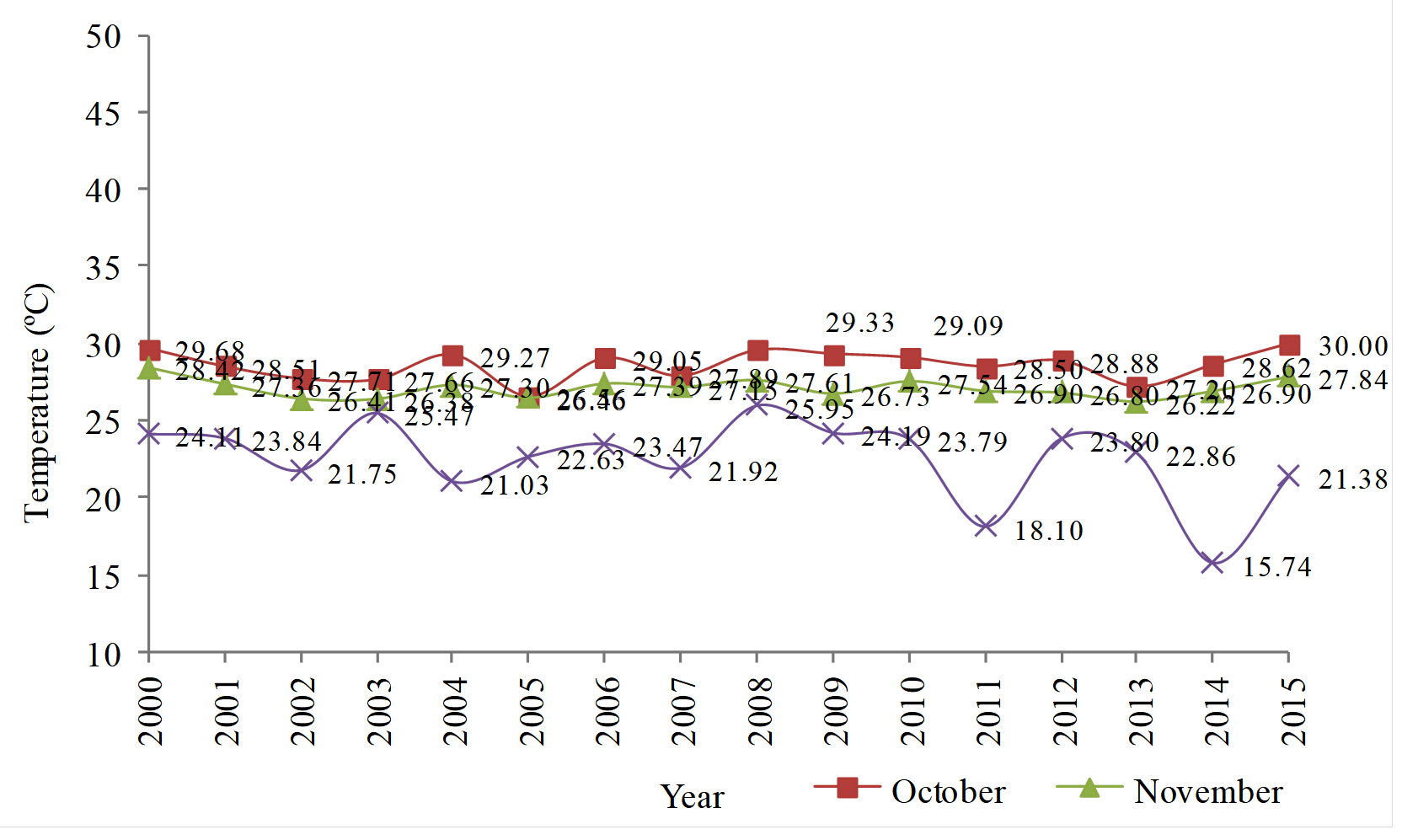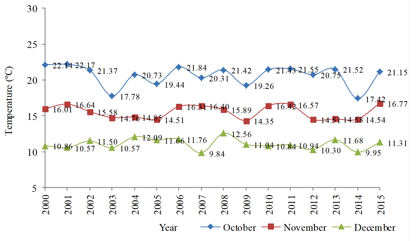The average day temperature for the months of October and November was not changed much during 2000 to 2015 (Figure 8). December is showing declining trend continuously during the recorded period.