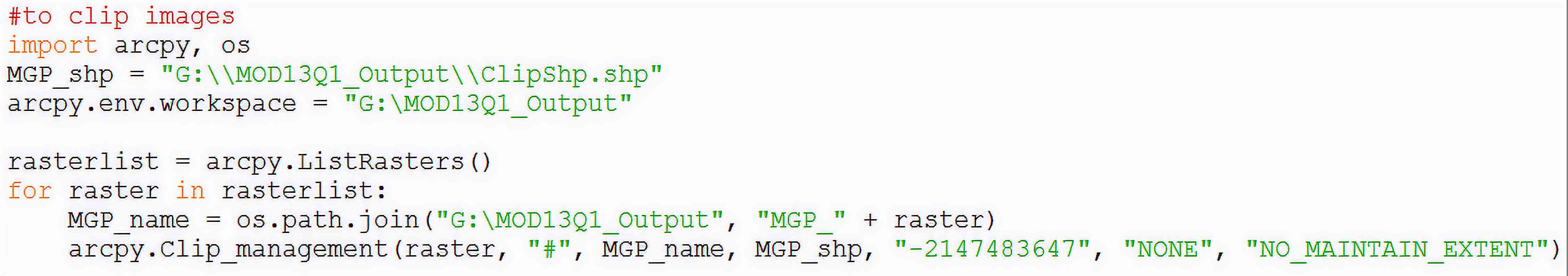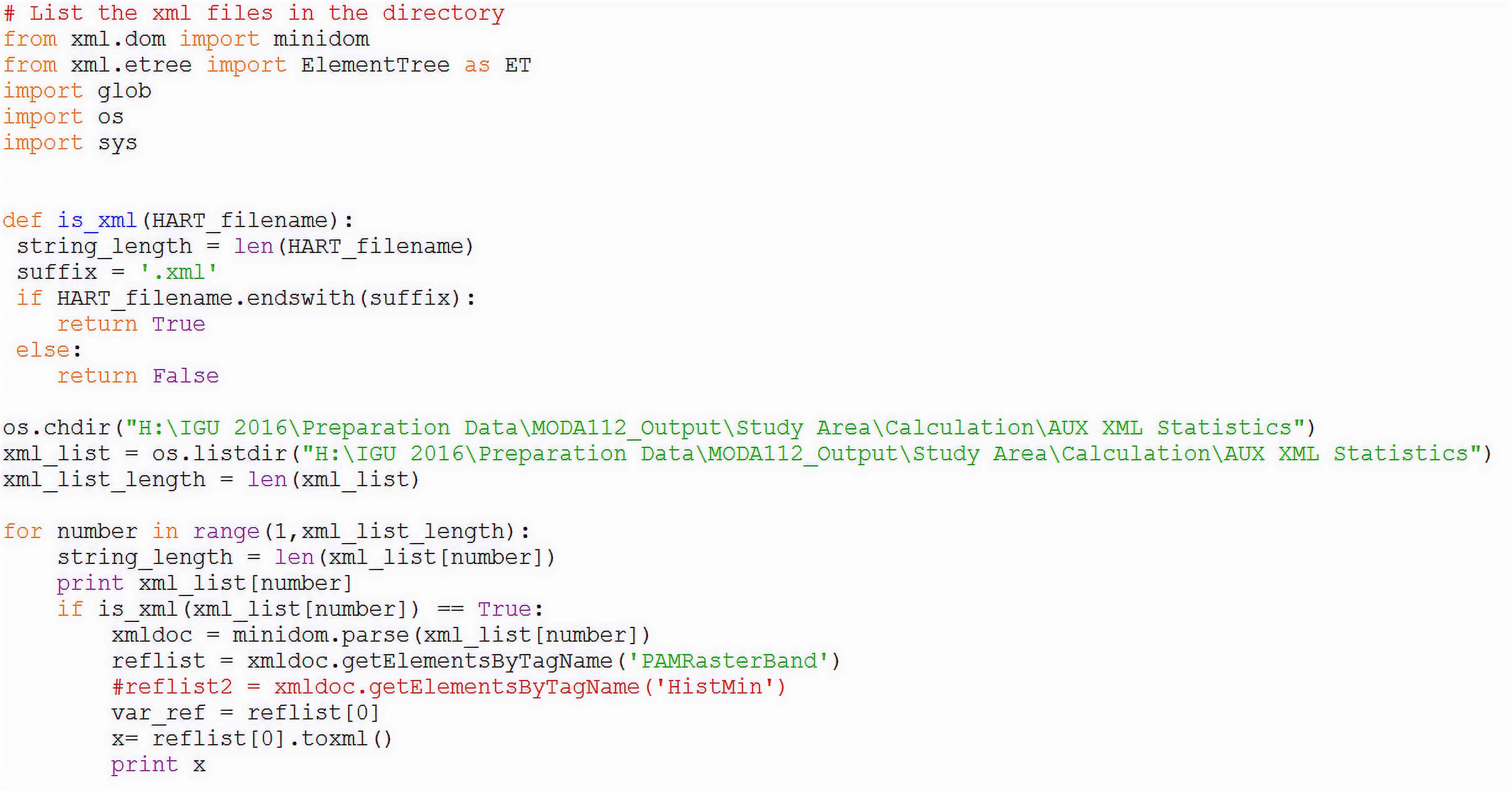 The script details describing the clipping of Raster files using shape file (Figure 2). The general statistics, mean, maximum and minimum, etc., of individual image was calculated using the Python script (Figure 3). Calculated values were saved into Extended Markup Language (XML) for feasible uses of values further sample data value of calculated statistics of single TIFF file (Figure 4) (Clauss et al., 2016; Huang et al., 2012).