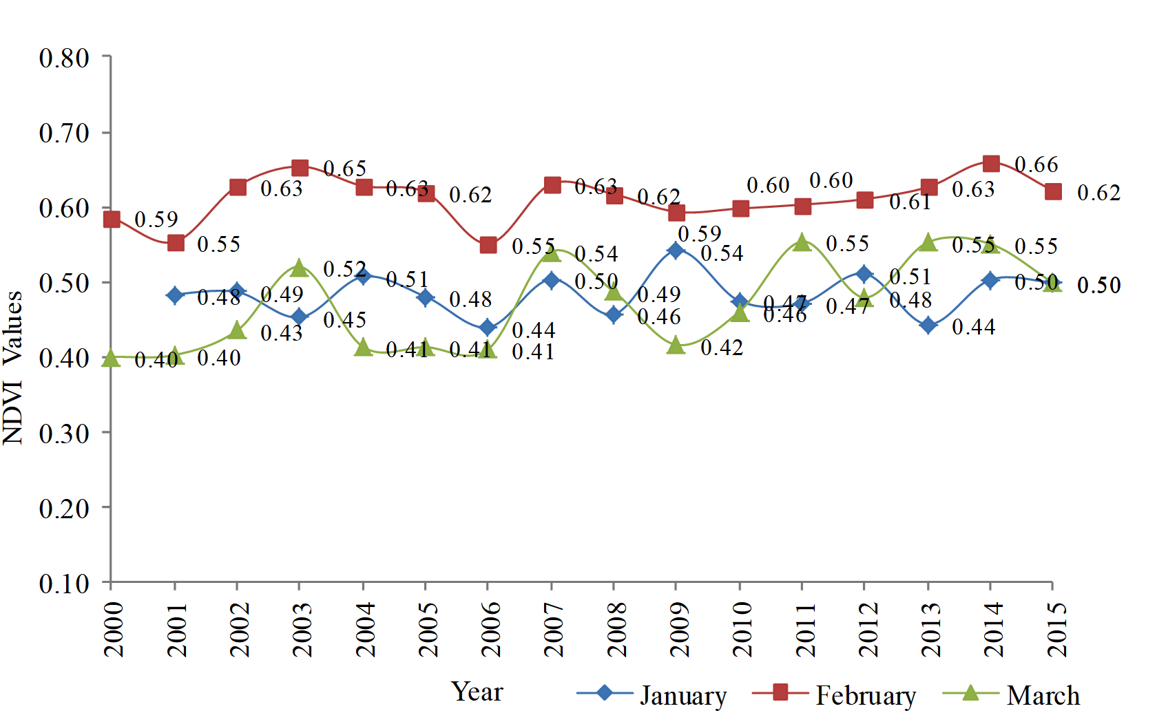 Figure 13. Mean NDVI Pixel Value: January to March (2000 to 2015)