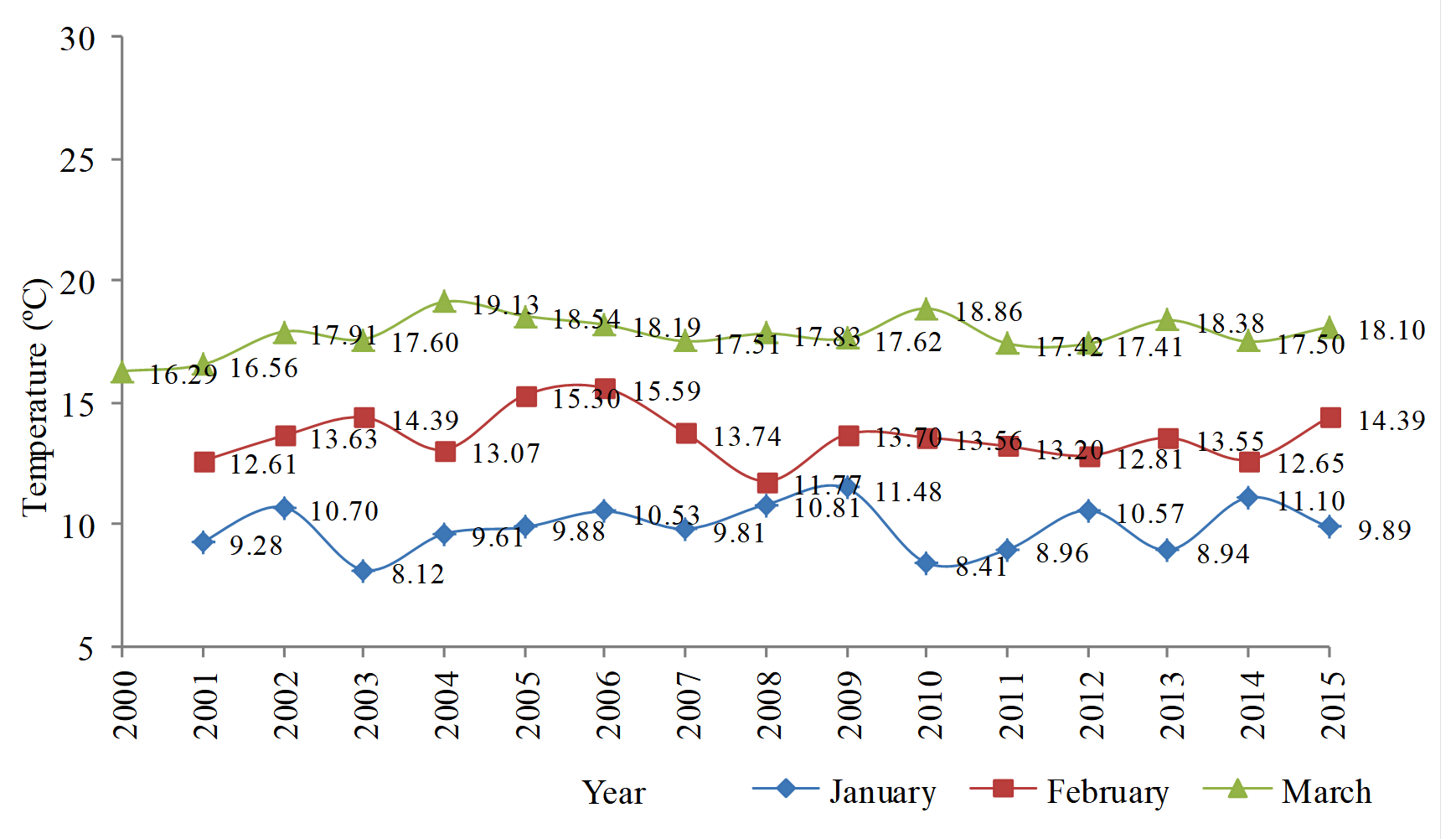 Figure 9. Mean Nighttime Temperature: January to March (2000 to 2015)