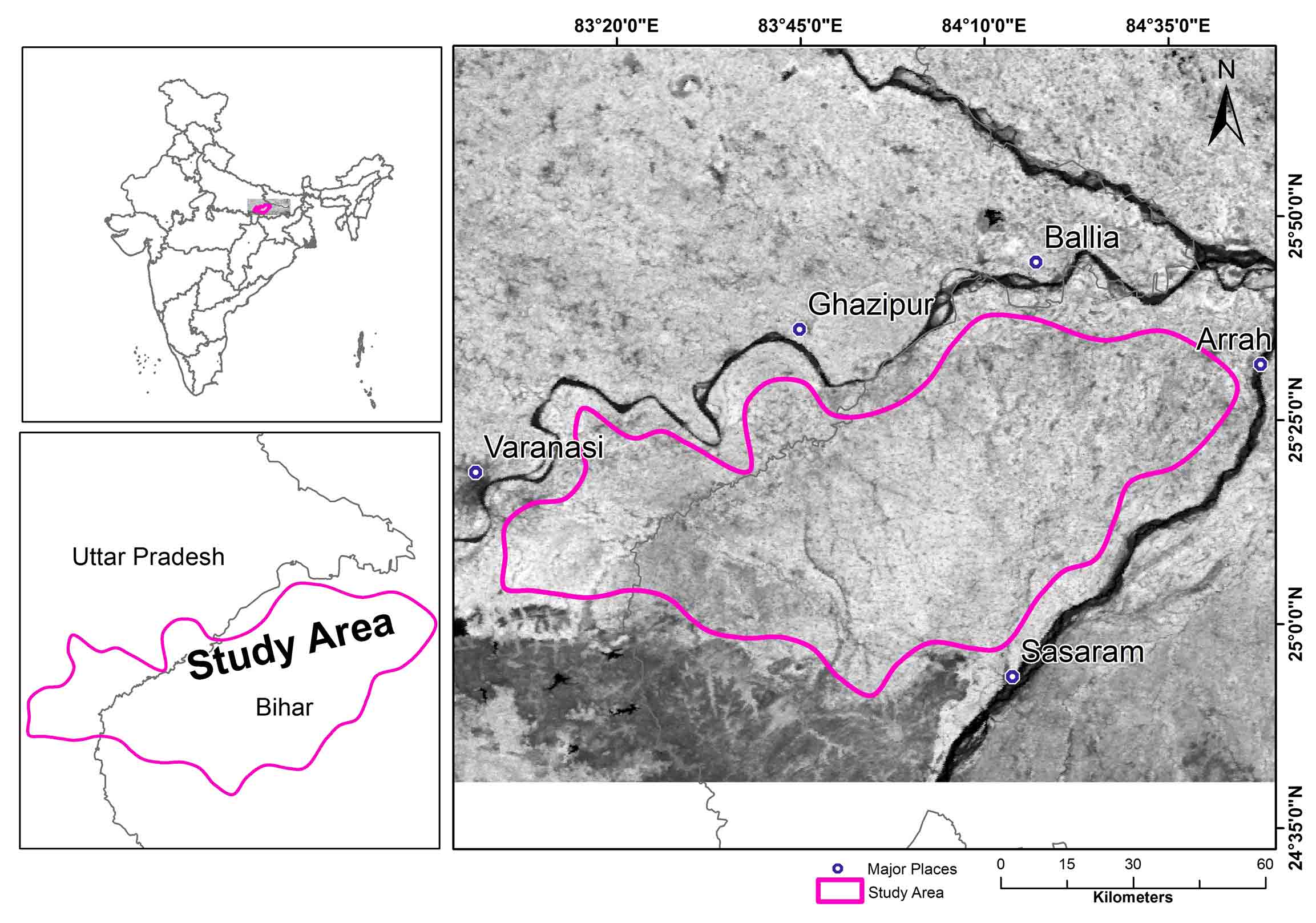 The study area counters from 25°40'18.438"N, 83°3'54.026"E to 24°51'50.725"N , 84°41'41.285"E. It covers an area of ~ 8000 sq. km., which is almost 10.6% of total floodplain of Son-Ganga confluence zone (75,000 km2). The maximum temperature is observed in May and minimum in January. This area received moderate to high rainfall (450-700 mm). The study area has alluvium soil with good agriculture. Major crops are rice, wheat and sugarcane. The major cities are Varanasi, Ghajipur and Ballia from Uttar Pradesh and Patna, Arrah and Sasaram from Bihar (Figure 1).