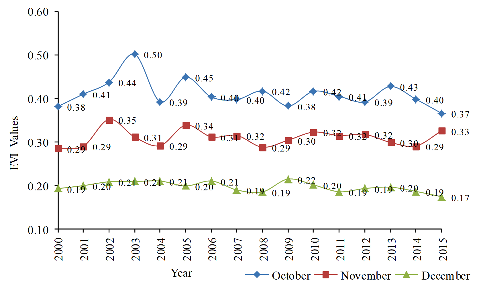 Figure 20. Mean EVI Pixel Value: October to December (2000 to 2015)