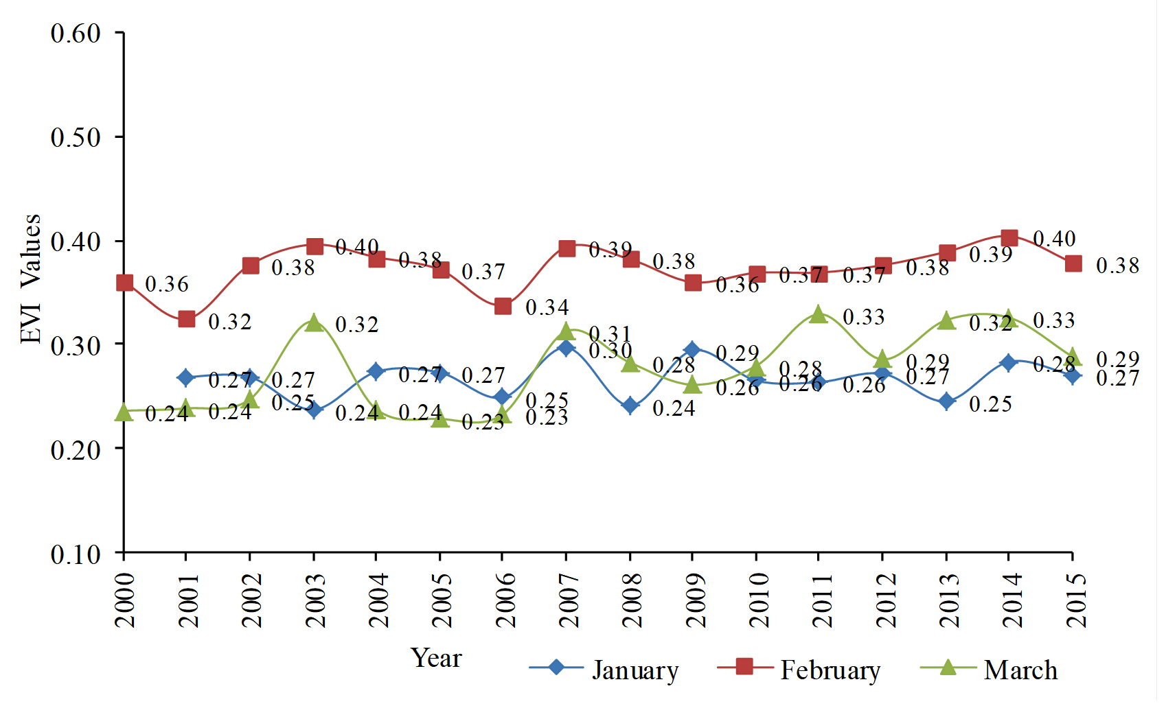 Figure 17. Mean EVI Pixel Value: January to March (2000 to 2015)