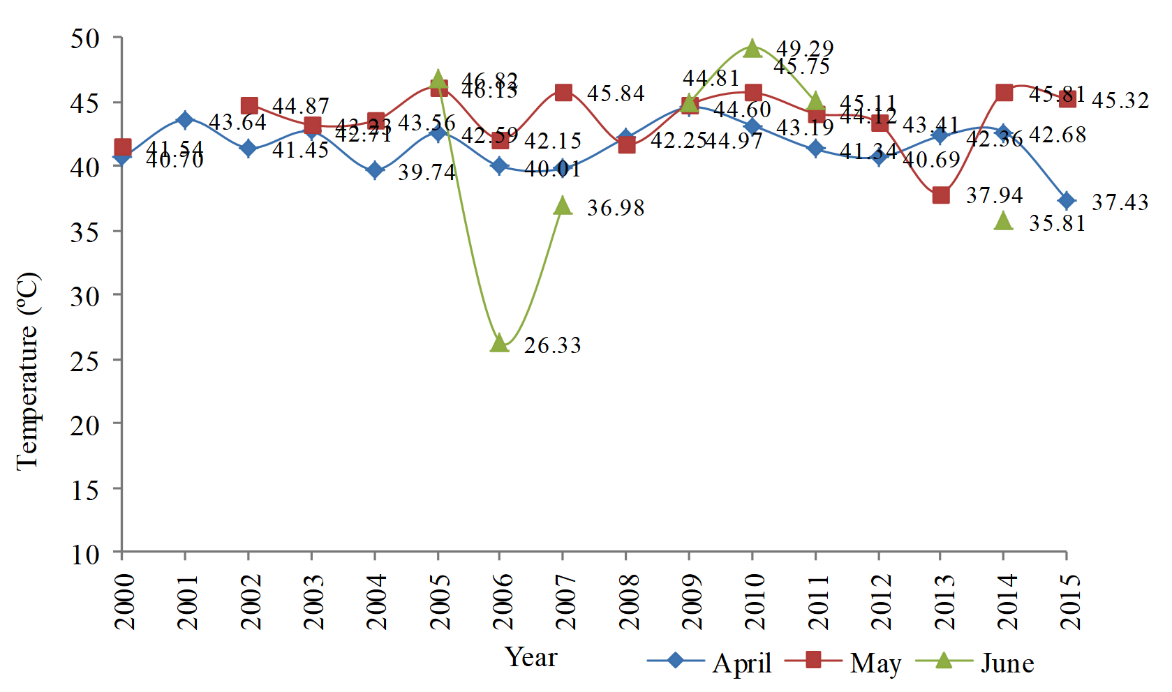 The average day time temperature for the month of January has been fallen for around 2°C (Figure 5). While for the month of February and March the declining trend is almost same. The average day temperature for the month of April was decreased for almost 4°C (Figure 6). Month of May 2015 is recorded high temperature in comparison of 2001. Due to cloud cover on arrival of monsoon in Indian subcontinent the data could not recorded for the month of June and reliability even on the recorded data for the plotted years cannot be trusted.