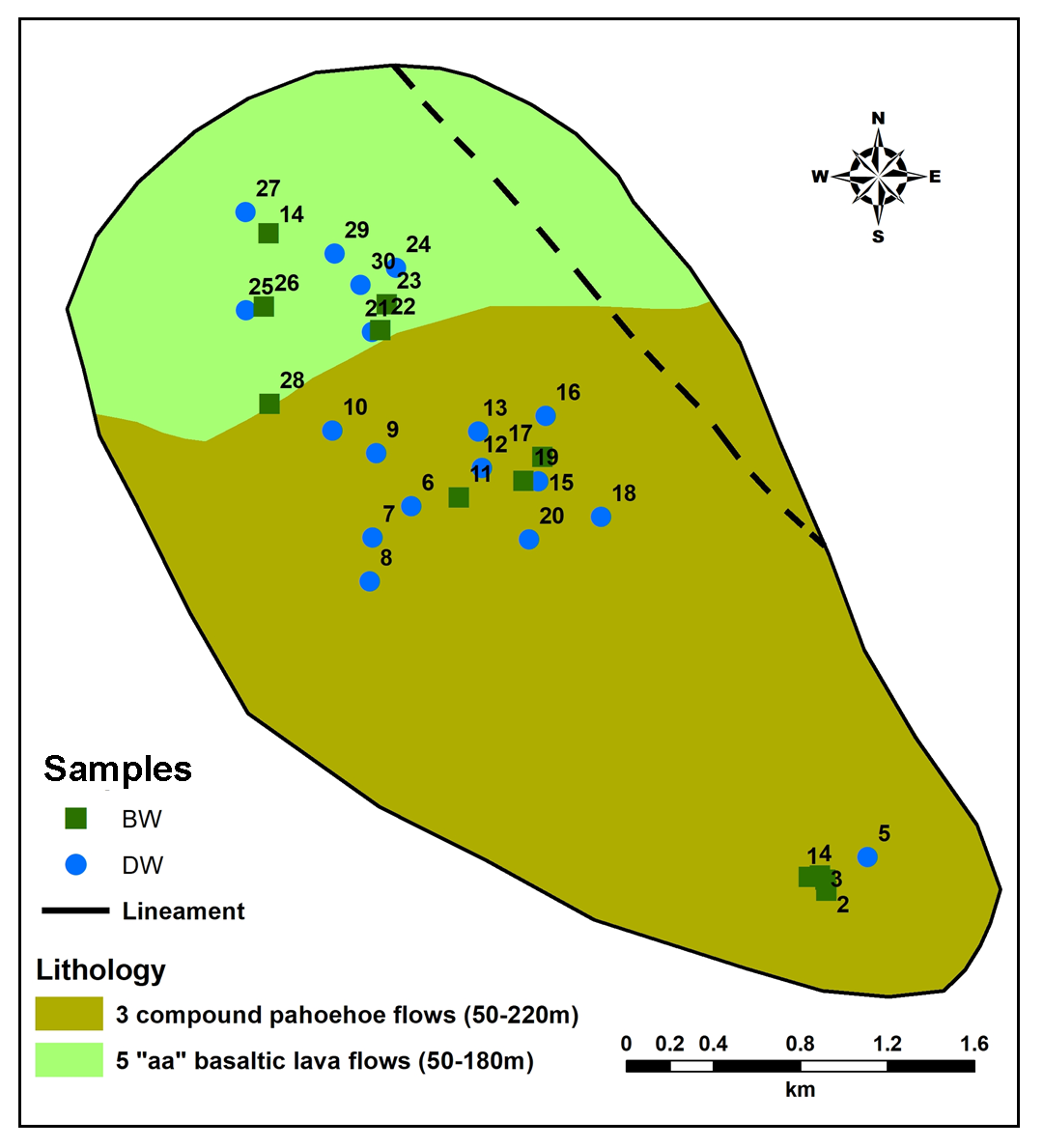 The study area is a part of Central Deccan Trap, Supergroup. Indrayani Formation and Upper Ratangarh Formation are exposed (Figure 4). Indrayani Formation is typically characterized by the presence of compact, massive, porphyritic basalts where the phenocrysts are embedded in fine-grained groundmass (GSI, 2001). Jointing nature have attributed them to be moderately good aquifers (Figure 4). They are seen occurring in low-lying flat plain areas of Vel River basin (GSI, 2001). Upper Ratangarh Formation is consisting of 3 compound pahoehoe flows (50-220m) thick in the area under investigation. It comprises mainly dark grey, fine to medium grained, massive hard and compact, non-porphyritic to porphyritic in nature with olivine phenocrysts (Godbole et al., 1996; GSI, 2001).
