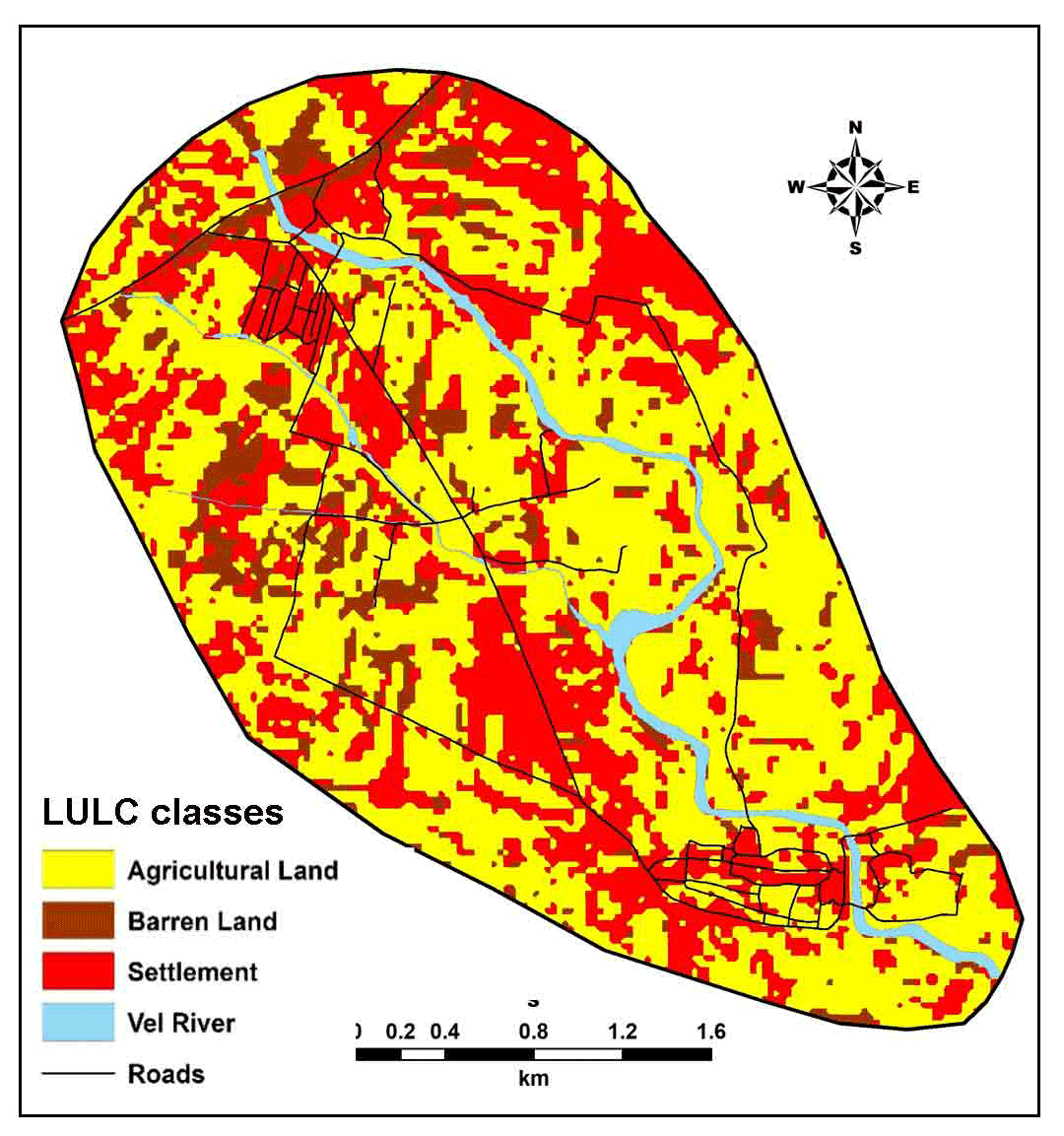 Annual rainfall is about 650 mm, receives from June to October (IMD, 2015). An average temperature ranges from 10 to 28°C. Gently rolling topography observed in the area and alluvial deposits mainly along the river course. Vel River (length 5866 m) is the major river flowing with two tributaries of 2665m and 1100m lengths (Figure 1).