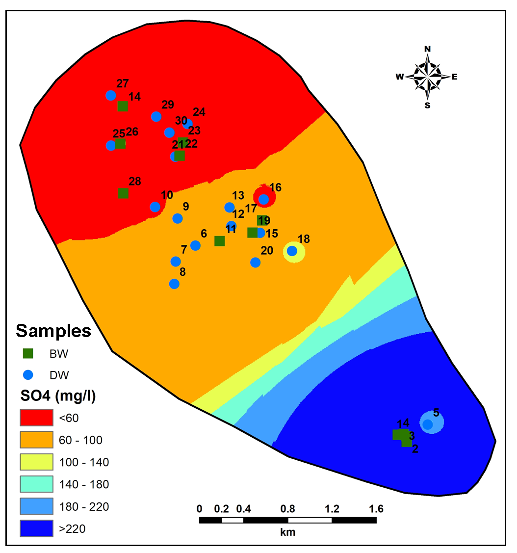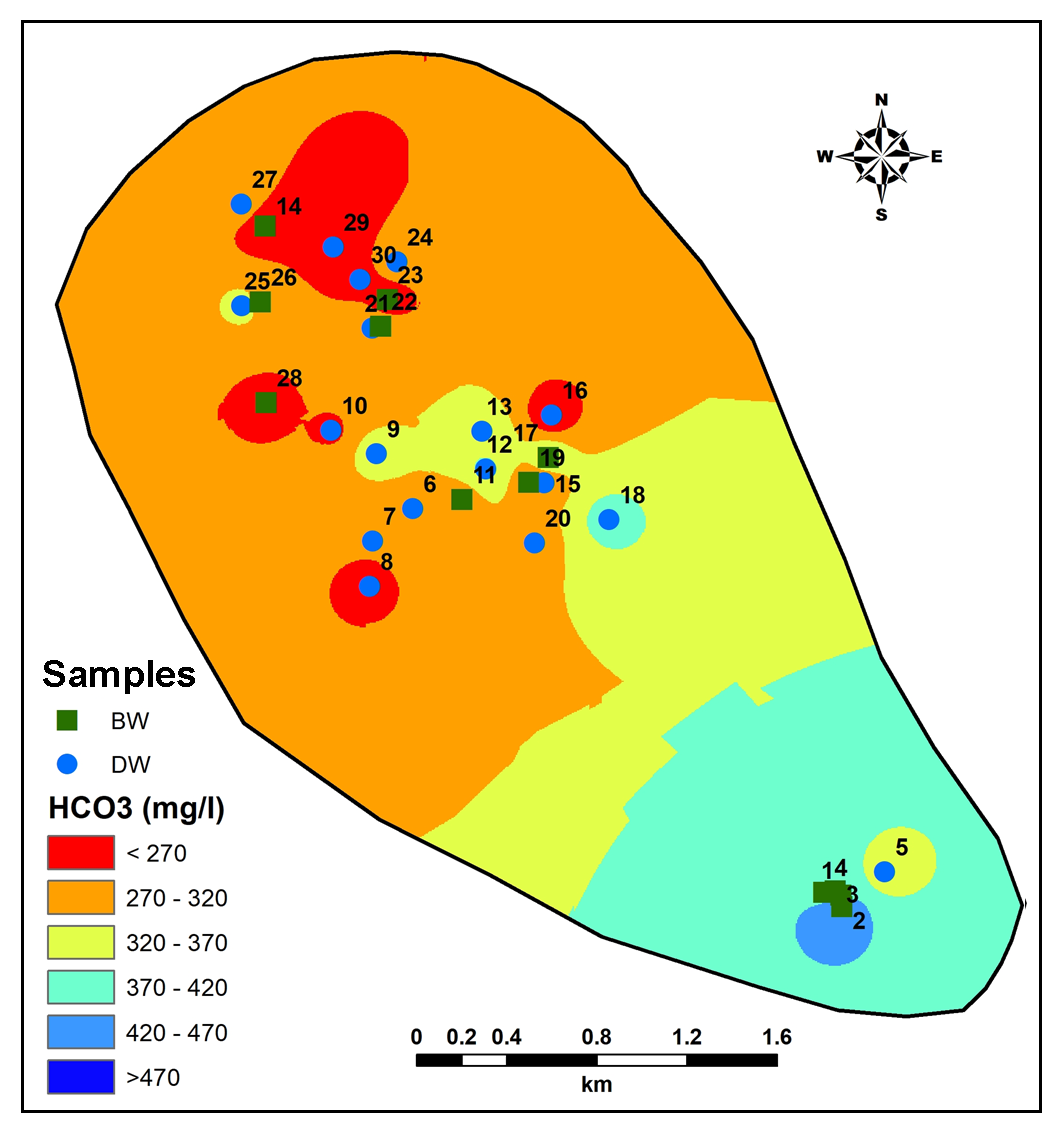 Chloride is the major anion (range: 1.43 to 781.76 mg/l; average: 335.40 mg/l) in groundwater of the study area. Higher values of chloride are reported in the Central and Southern parts (Figure 13). Cl concentration increases from upstream and downstream region (Pawar et al., 2008). Higher concentrations of chloride (Figure 13) found i. e. 781.7, 756.7 and 737.51mg/l in BW-4, BW-3 and DW-9, respectively, may be due to the accumulation of industrial waste in downstream part (Hem, 1959).