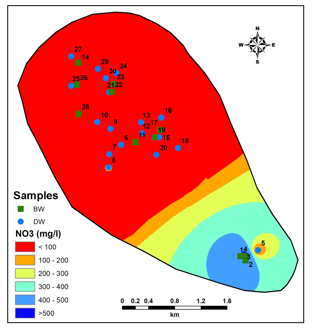 The concentration of nitrate in groundwater shows range from 3.20 to 587.71mg/l and very high compare to the permissible standards by WHO. The source of NO3 in groundwater is solid and liquid waste from human and livestock activities including agricultural runoff (Pawar et al., 2008; Brindha et al., 2010; Brindha and Elango, 2014).