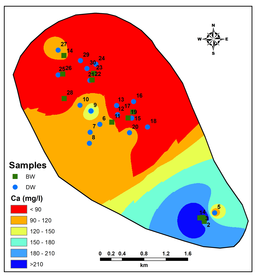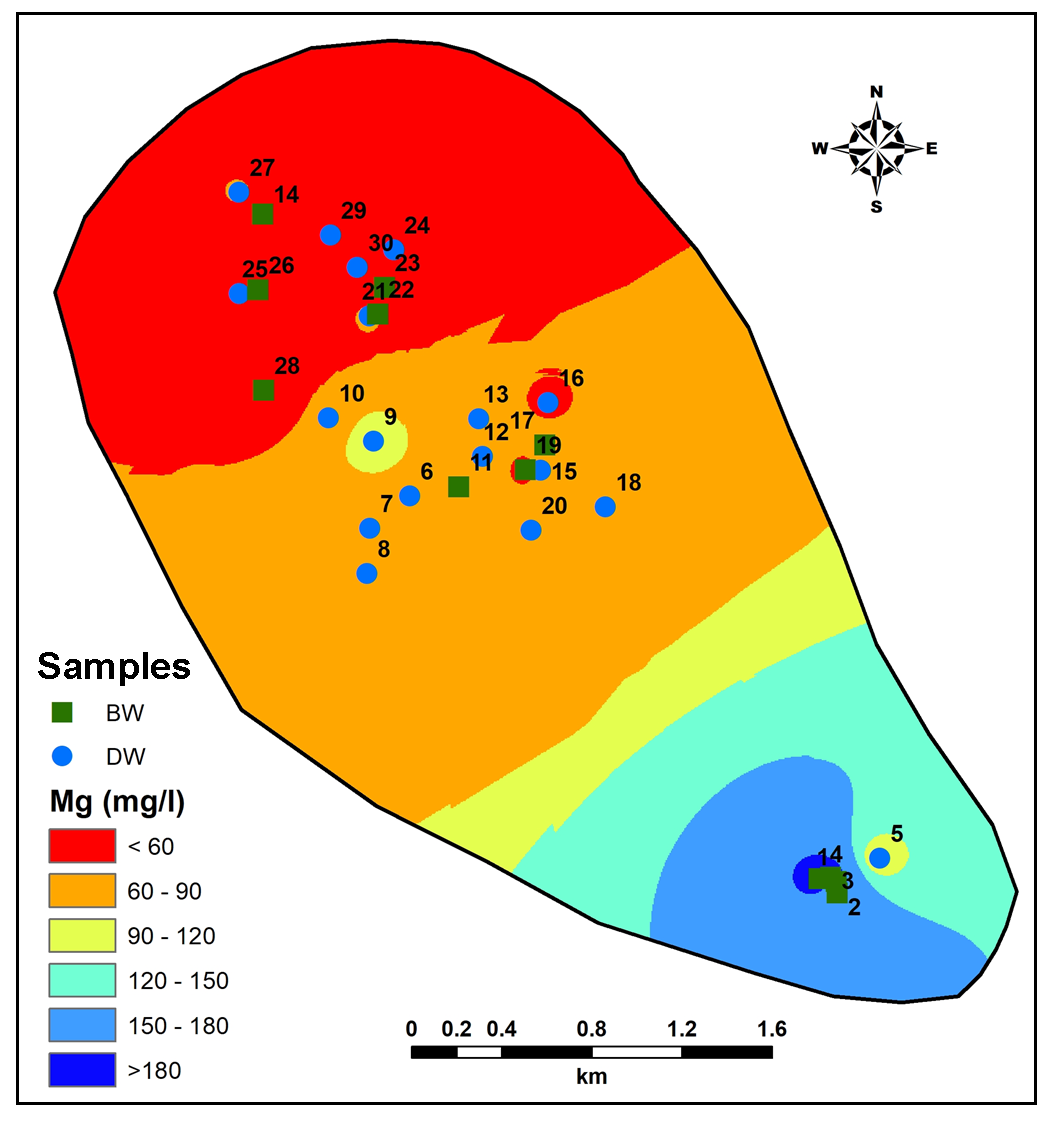 Mafic minerals are principal components in the lithology from the study area contributing towards more Magnesium (Mg) as one of the major dissolved constituent in the groundwater (Hem, 1959; Subramani et al., 2010). Concentration of Mg in groundwater from study area varies from 22.42 to 198.9mg/l (Figure 11). A closely spaced contour occurs in the lower part of study area implies high salinity zone. Increase in Ca (Figure 12) in the South-Central part where deeper rock-water nitration could be the source for Ca in groundwater (Hem, 1959). Thus, Na+Ca representing 61.37% of total cations denoting major supply from weathering of plagioclase feldspar (Pawar et al., 2008). On the other hand, Ca+Mg values account 67.92% of the total cations contributing from weathering of olivine and pyroxene (Pawar et al., 2008).
