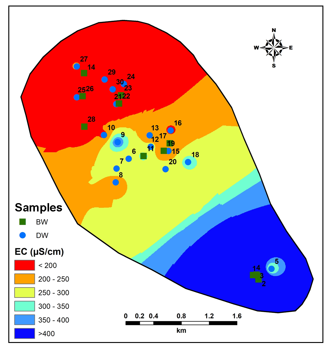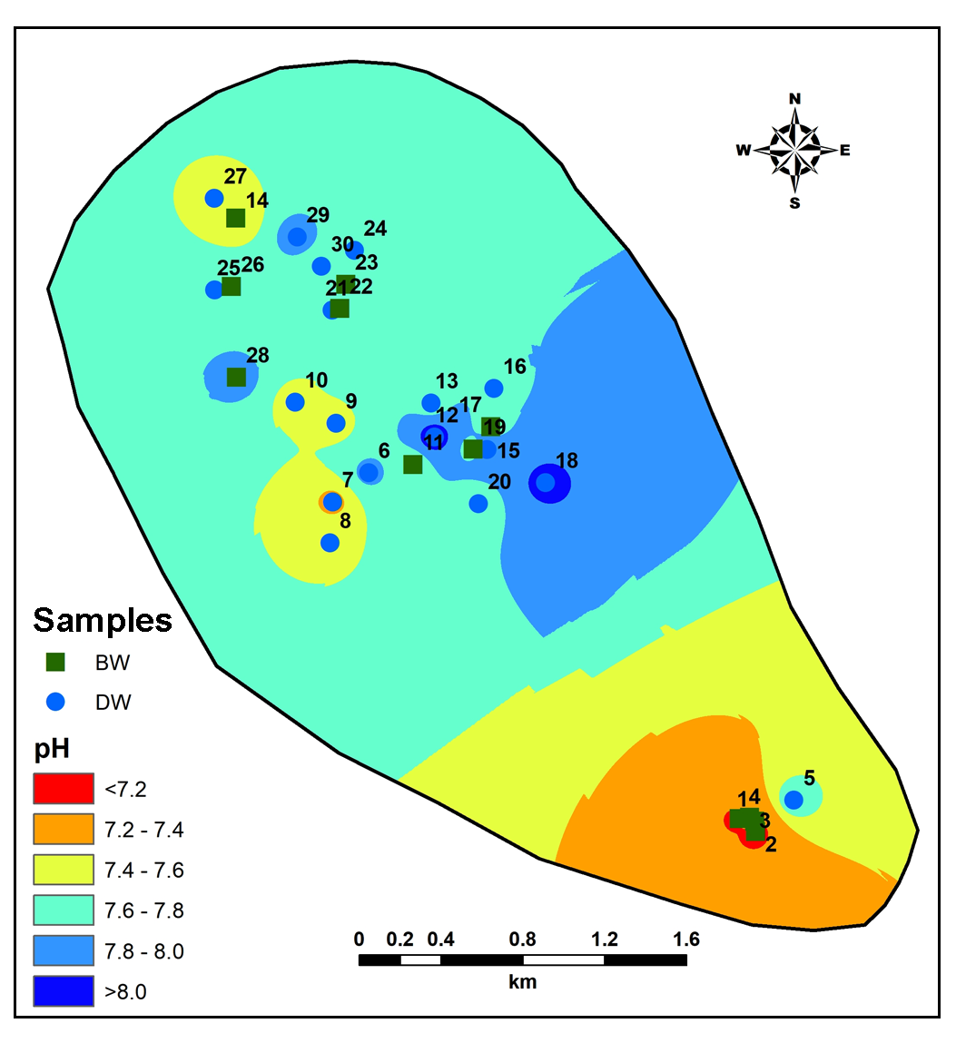 Groundwater in the region is slightly alkaline in nature (range: pH 7.12-8.19; average: 7.12) (Figure 7). The Electrical Conductivity (EC) is high (>1900 µS/cm) reported in the Central part, while lower values are estimated in the Northwest part of the region (Figure 8). Average value of EC (781 μmhos/cm) shows high mineralization in the groundwater (Pawar et al., 2008; Rubasinghe et al., 2015).