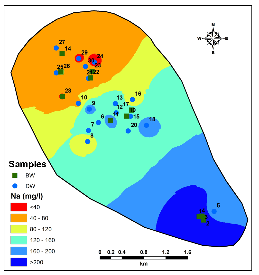 Increase in concentration of Sodium (Na) (Figure 9) from Northwest to Southeast parts due to changes in hydro-geomorphological settings (e.g., slope) (Pawar et al., 2008) and groundwater flow except in Central part where highest Na found due to more rock-water interaction (Hem, 1959).