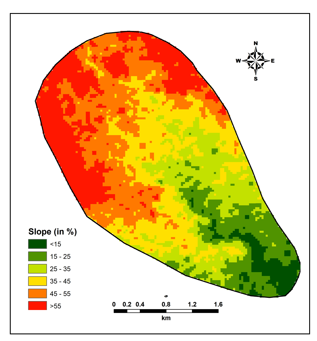 The slope is estimated from ASTER images and varies 15% to 55% (Figure 2). Gentle slopes result in slower runoff and less rate of erosion with good recharge potentials (Kadam et al., 2012; Mundalik et al., 2018).