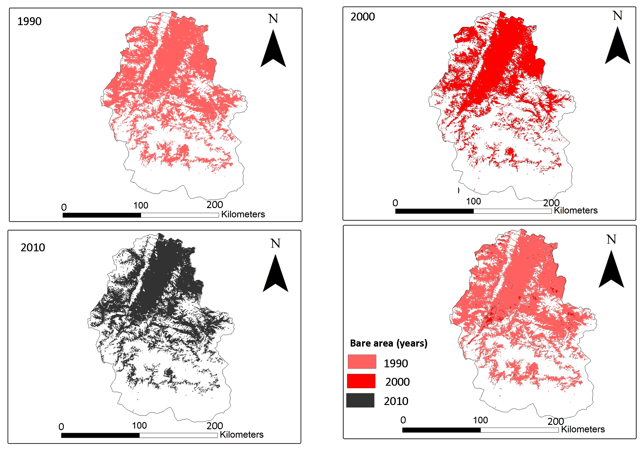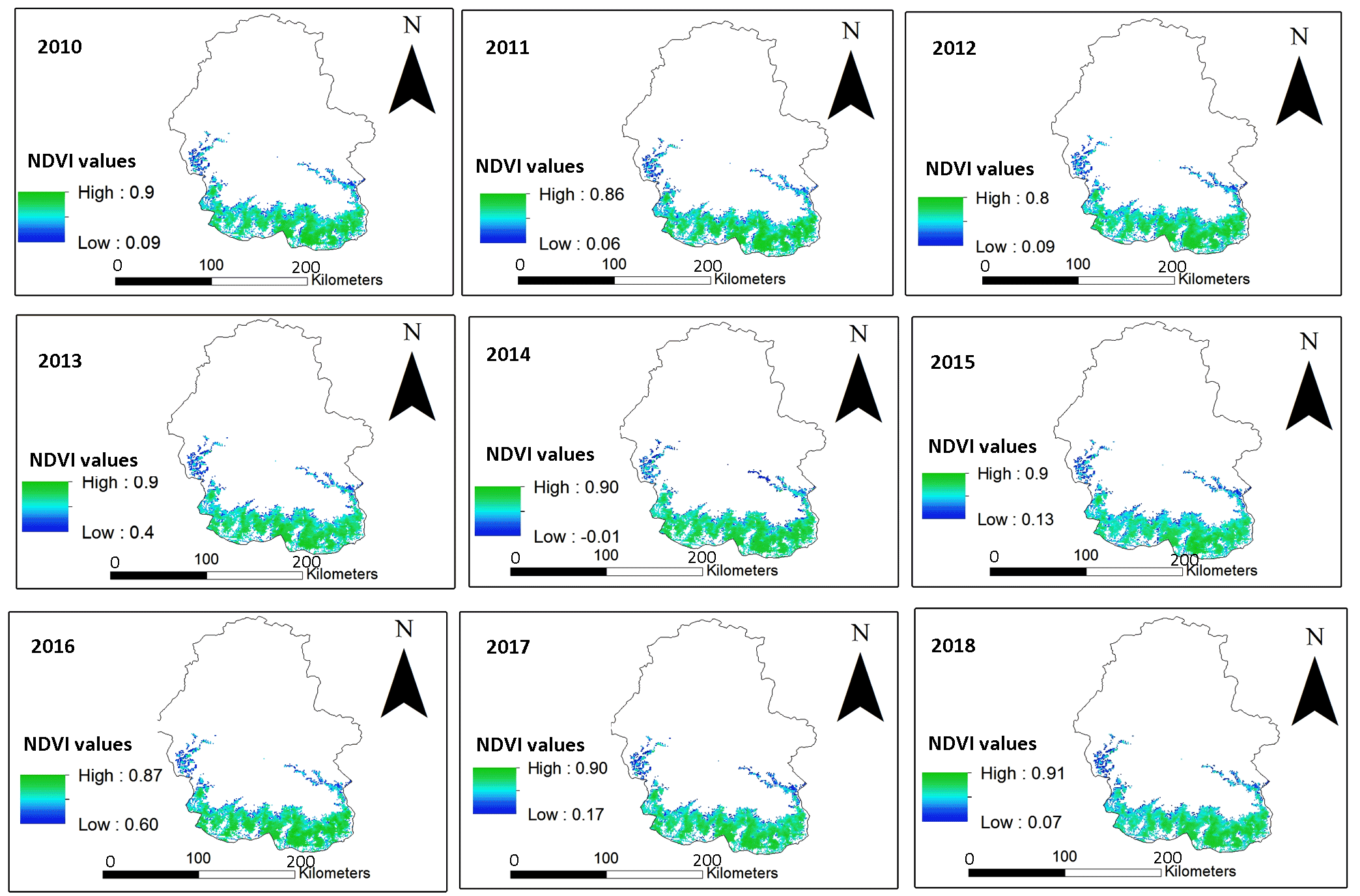 The values were categorized into discrete classes by slicing range of NDVI values into four different ranges by fixing the thresholds with following natural break method. A similar analogous step was followed for all different time series year image as vegetative and forest area only classified with different ranges values. A quick examination of pseudocolor images of NDVI and classified output of NDVI images divulge that along with the water bodies, snow and built-up, barren land yield towards negative values. Similarly, the vegetative areas to forest area yield towards the positive values. This method is applied for the comparison of land and vegetation cover change from multiple dates vegetation index (NDVI). NDVI values indicate the status of vegetation in the study area and were classified into: no vegetation, less vegetation, moderate vegetation, and dense vegetation. NDVI changes in vegetative area indicate the status of grassland, forest land and agriculture in different time periods. The annual NDVI values ranging from 0.9 to 0.5 and 0.8 to 0.4 (Table 3) in the different year show the Southeastern and Southwestern parts of the ACA have high dense vegetation than other parts of the region (Figure 10).